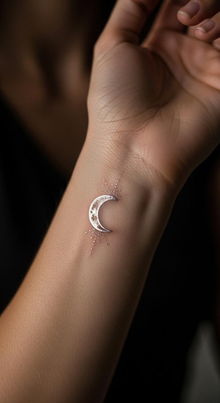 Celestial moons as crescent shapes glow quietly. Wrist is convenient. Shape it basic. Find moon pros with discounts. Ads list them. Draw moons in a notebook. Pick phases. Opt for shapes. Do it budget-friendly. Watches hide. This tattoo orbits dreams. Apps preview. Adjust fast. Care simply. Your moon rises. Follow its light.