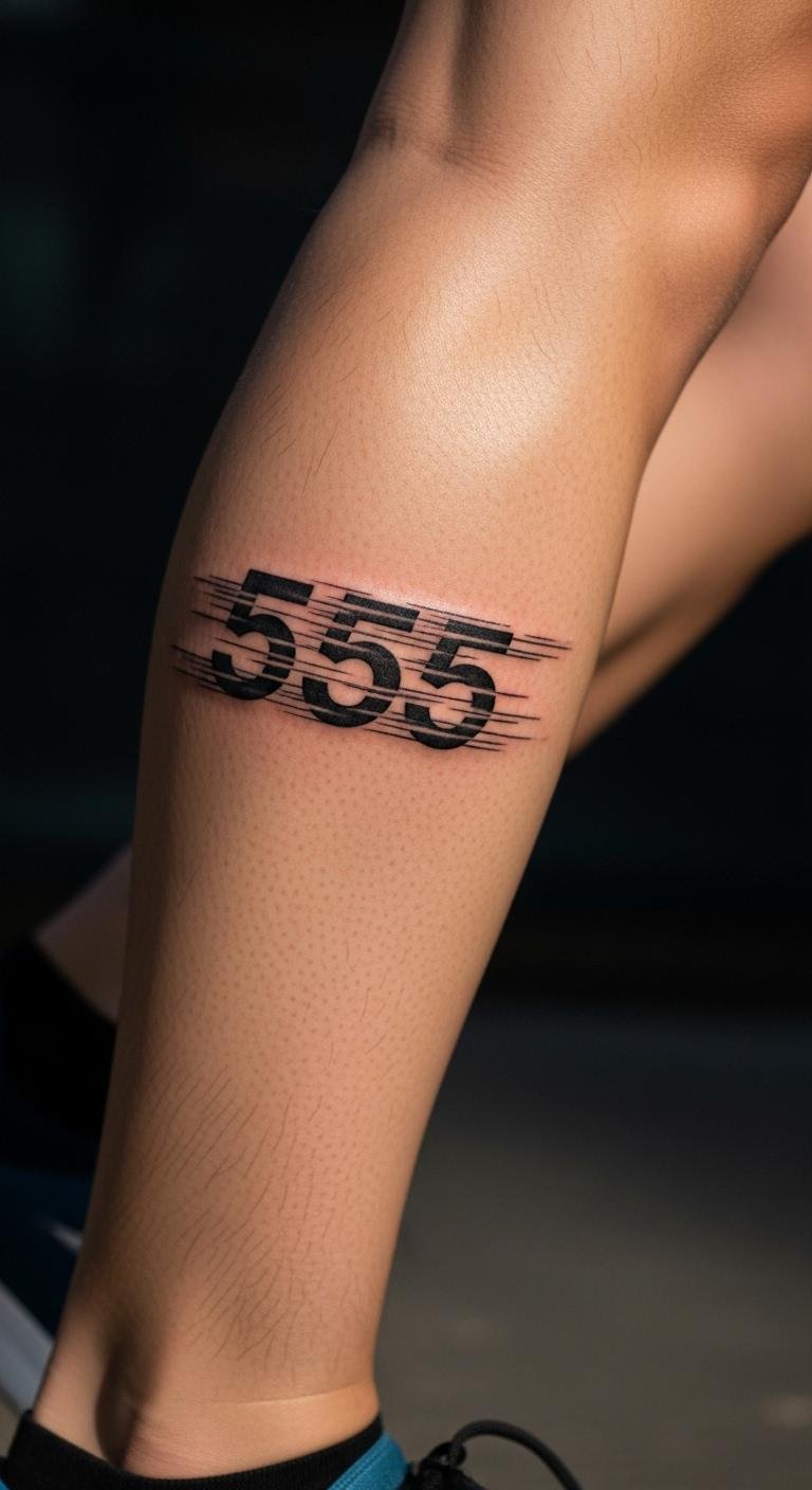 555 on the leg highlights progress. Add arrows for direction. Sketch with free tools. Leg 555 means motion. Tattoo for around $50. Use tape for trials.