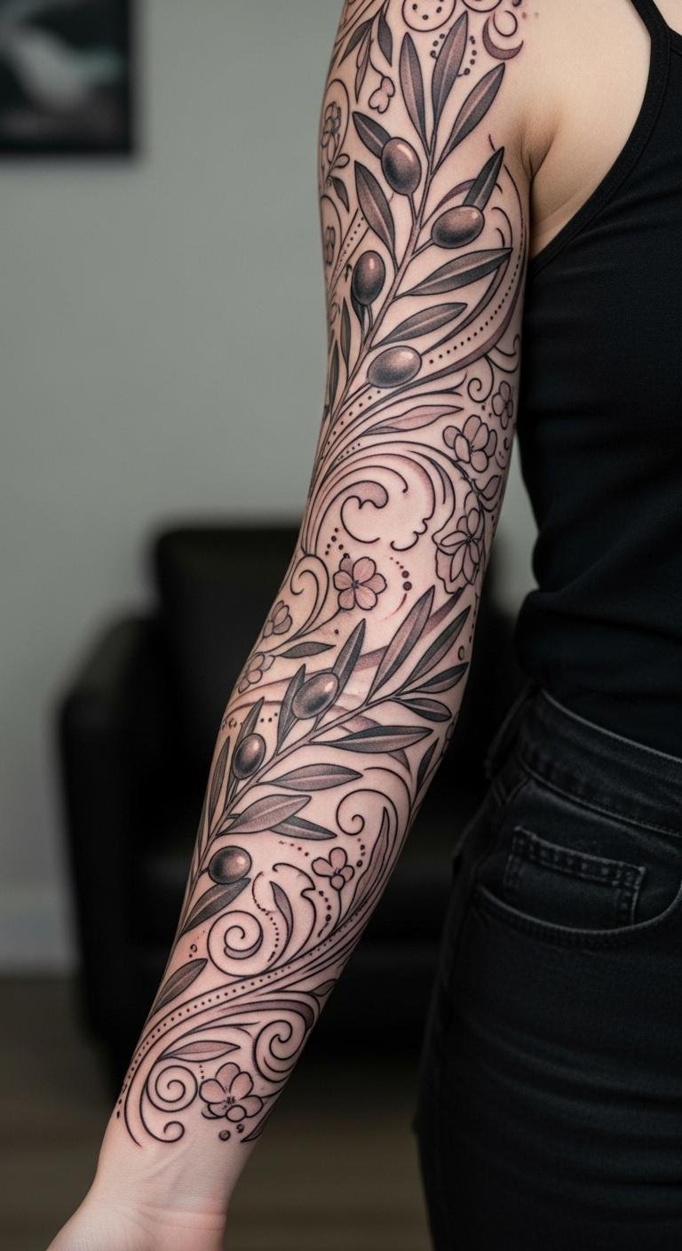 Build a sleeve around olive branches for a big statement. Start small with one branch and expand. Draw elements on paper to plan your layout. Use apps for free design ideas. A full sleeve might cost $500, but phase it in. Mix with flowers for balance. Place branches along your arm for flow. Try temporary tattoos first to visualize. This builds your story over time. Share progress with an artist to save money. It’s a smart way to create art.