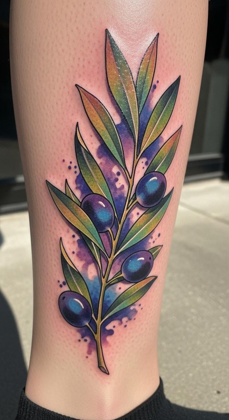 Play with colors in your olive branch. This adds personality. Mix paints at home for ideas. Online videos guide you. A colored tattoo is around $100. Place it on your leg for fun. Experiment with shades first. This keeps it budget-friendly and exciting.