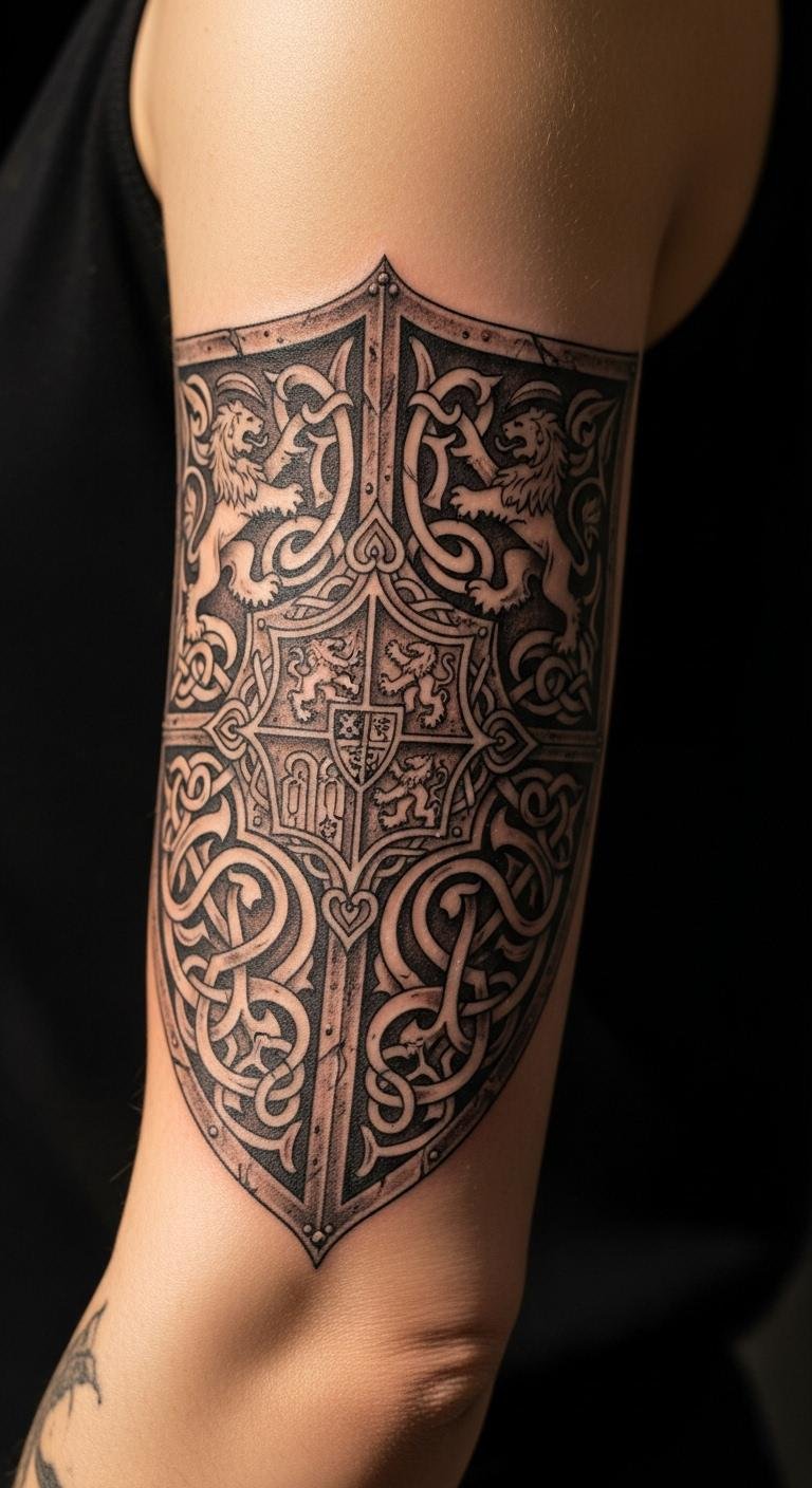 Shields with ornaments show you’re protected. This design is both pretty and powerful. Place it on your arm for show. Sketch shields at home with patterns. Artists offer these for around $80. Try paper cutouts for placement. Add swirls for style. It guards your spirit. Quick, cheap sessions work best. Digital tools refine ideas fast. Wear it with pride.