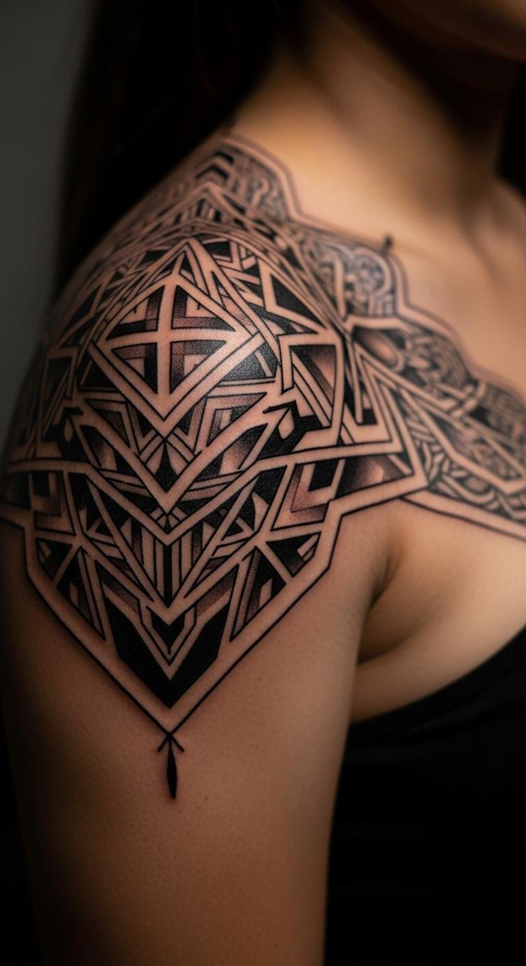 Geometric shoulder tattoos create a sense of harmony with shapes like triangles or hexagons. They sit well on curved areas for a balanced feel. Choose patterns that reflect your vibe, such as a simple grid. Save money by sketching ideas at home with basic drawing tools. A session could run around $150, depending on size. Keep it straightforward: Start small with one shape and build up. Real DIY example: Use string and pins to map out symmetry on your skin before ink. This helps avoid mistakes. Go for clean edges to make it pop. Pair it with clothing that shows it off, like a tank top. It’s an easy way to express balance in your life.