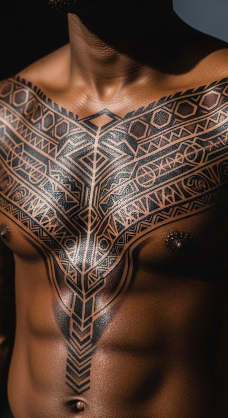 Chest geometric tattoos feature hexagons for modern vibes. They cover the center for impact. Opt for shapes that align with your build. Budget tip: Use basic ink colors to cut costs, around $200. Real DIY example: Arrange blocks with tape on your chest first. Layer as you go. This aids precision. Reveal it in fitted shirts. It’s a direct way to stand out.