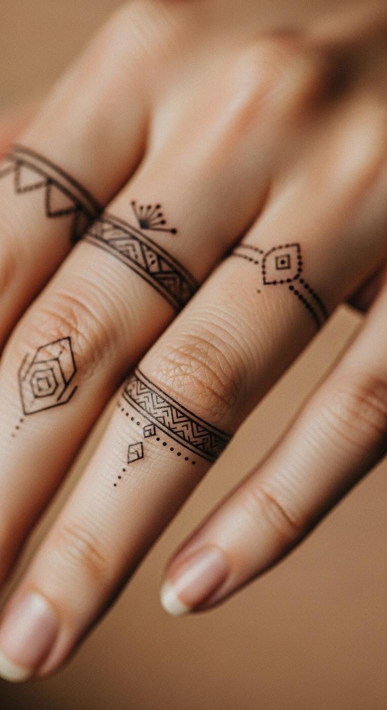 Henna-inspired finger tattoos offer intricate loops and swirls for a cultural touch. They work great on digits for subtle flair. Select motifs that tell your story, like simple vines. Keep costs down by choosing smaller designs, around $50 or less. Real DIY example: Practice with henna kits from the store to preview the look. Build it step by step: Start with one finger and add more as you go. This makes it manageable. Use it to enhance your hand gestures in photos. It’s an affordable way to try something new without commitment.
