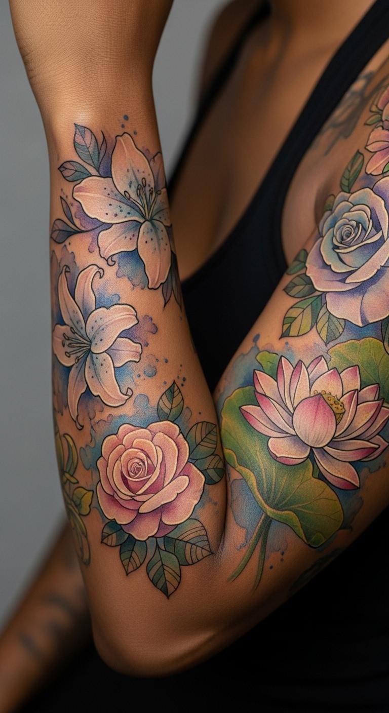 Watercolor floral arm tattoos mix soft colors for a painted effect. Flowers like roses add a fresh twist to your sleeve. Pick hues that complement your skin for the best look. Budget-friendly tip: Look for local artists with package deals to cut costs, maybe under $200. Start by collecting inspiration from free phone apps. Real DIY example: Experiment with washable markers to blend colors on your arm first. Break the design into layers: Add petals one at a time. This keeps it fun and low-risk. Wear it as a statement piece with short sleeves. It’s a simple way to bring art to your everyday style.
