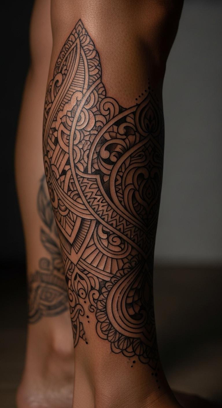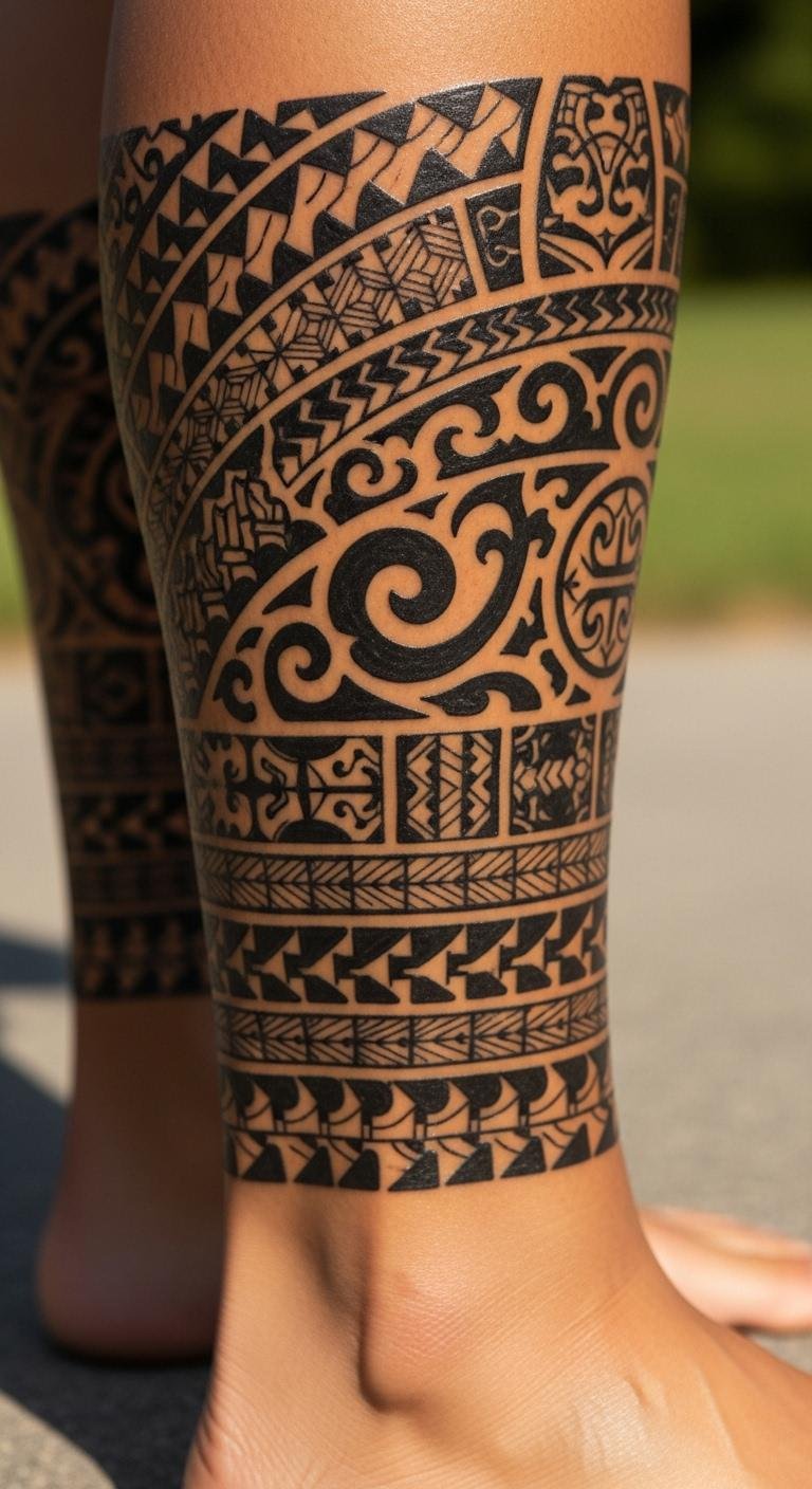 Polynesian tribal leg tattoos use waves and symbols for storytelling. They cover larger areas like calves with bold lines. Choose designs that resonate with you, such as ocean motifs. Budget tip: Opt for black ink only to reduce price, around $150. Real DIY example: Use stencils from free templates to test on your leg. Layer the patterns slowly for accuracy. This approach makes it approachable. Pair with shorts for summer vibes. It’s a straightforward way to honor traditions.