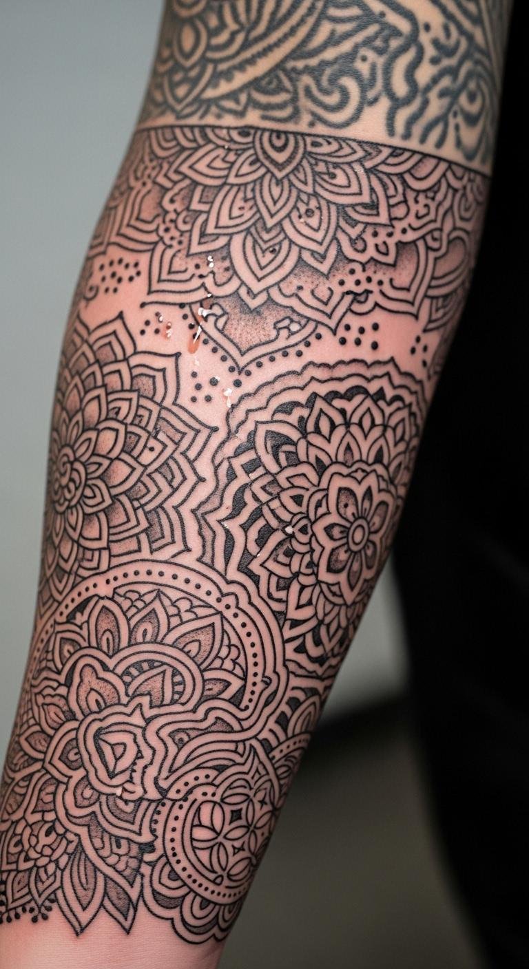 Full sleeve fusion mixes motifs like henna and tribal for a story. They flow from shoulder to wrist. Pick elements from your background. Affordable route: Build in sessions to spread costs, starting at $300. Real DIY example: Mix drawings from different cultures on paper. Add sections gradually. This keeps it flowing. Roll up sleeves to display it. It’s a practical storytelling tool.