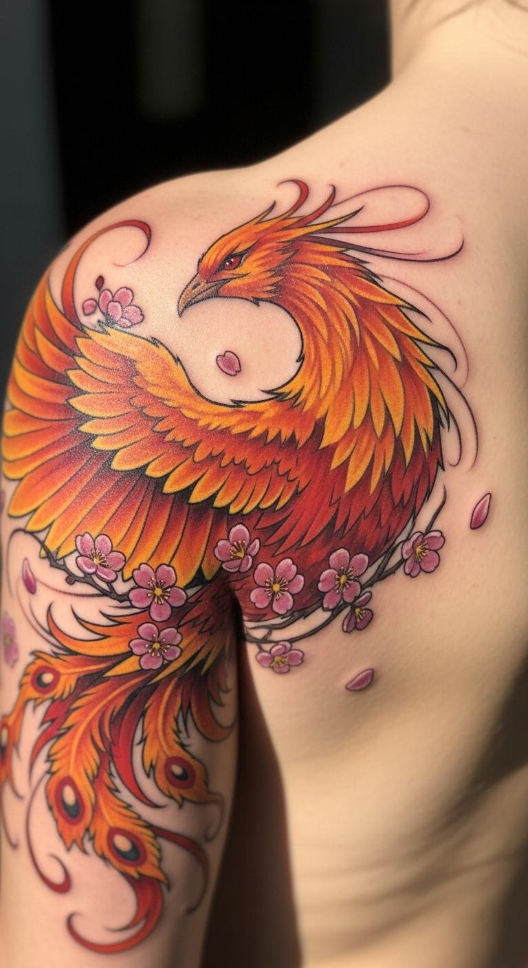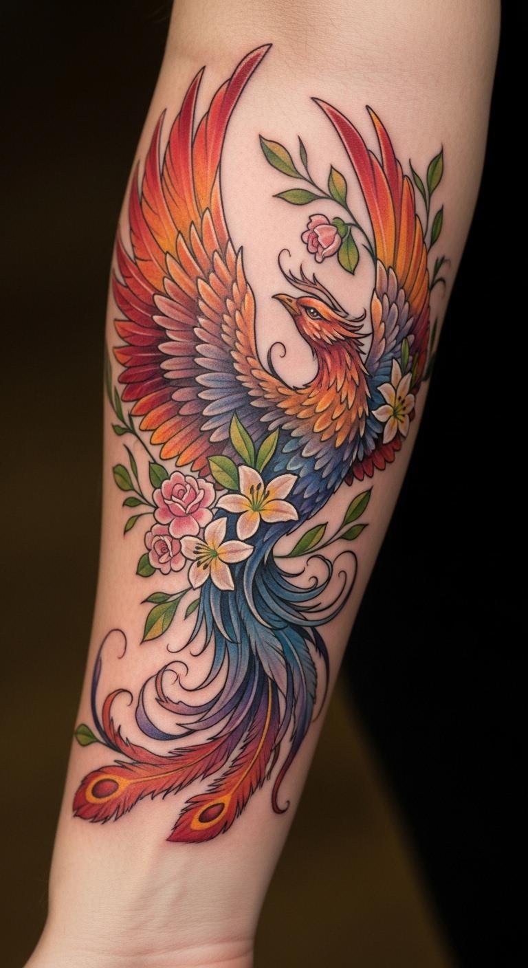 Picture a phoenix wrapped in roses and lilies. This design adds a soft touch to the classic bird. Start with a simple sketch on paper. Use free online tools like Canva to mix floral patterns. For a budget option, draw it yourself with markers before visiting a studio. Keep colors light for a feminine vibe. Bold the key: floral phoenix. Break it down: choose local flowers that mean something to you. This makes the tattoo personal and affordable. Aim for a small size to cut costs. Get inspired by nature walks. Then, find an artist who specializes in details. Your tattoo becomes a daily reminder of growth.