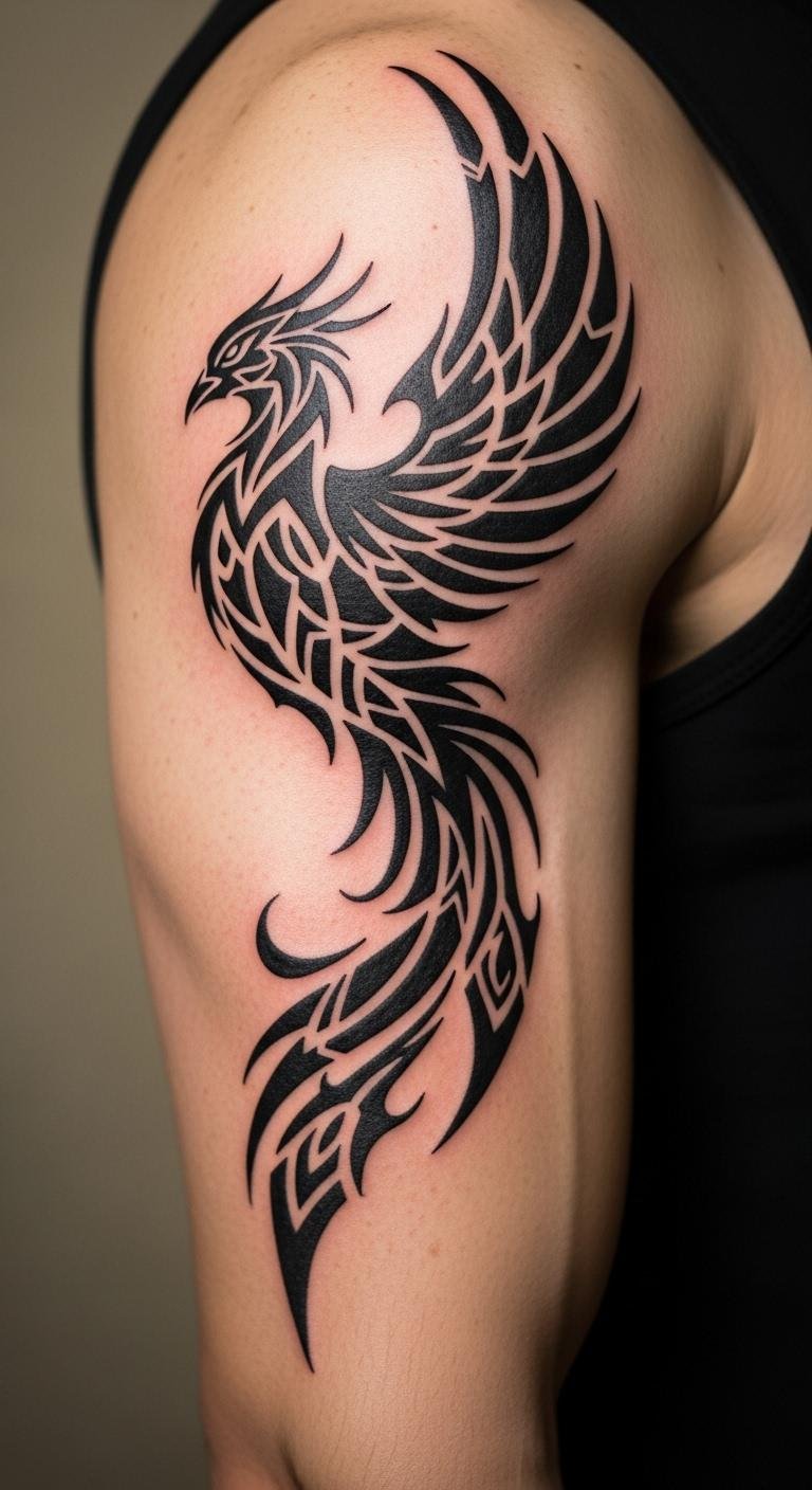Modern shapes twist the traditional bird. It’s artistic and fresh. Doodle abstracts freely. Apps distort designs for fun. Focus on forms over details. Abstract phoenix innovates. Choose a simple version. Add your shapes. Find modern artists affordably. Experiment with clay. This tattoo reimagines rebirth.