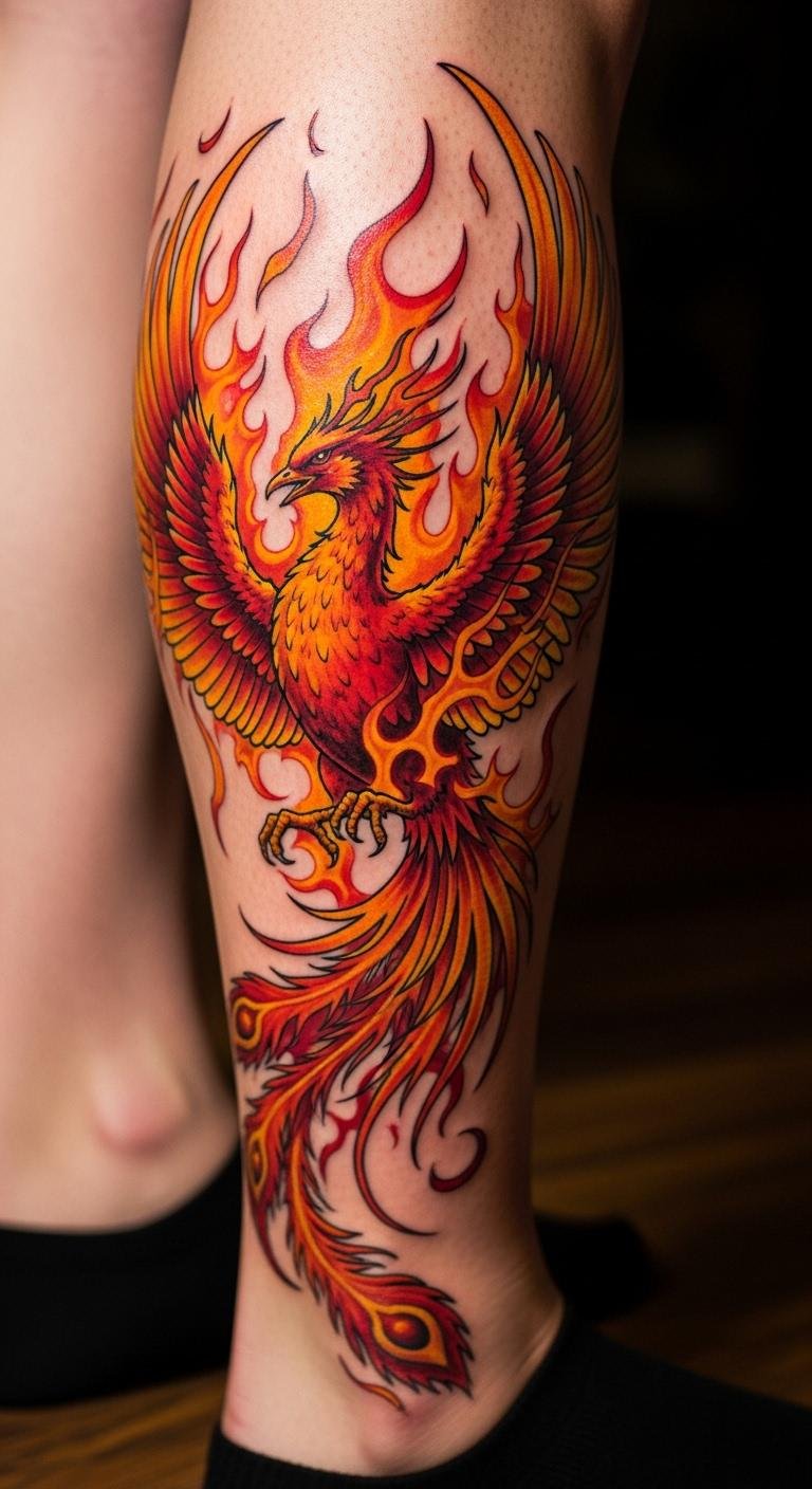 Flames lick up your leg for intensity. It’s bold and moving. Sketch fire patterns casually. Apps add flame animations free. Focus on motion lines. Leg phoenix flames ignite passion. Go for half-leg to save. Mix in your colors. Check for seasonal discounts. Use string art for practice. This design fuels your fire.