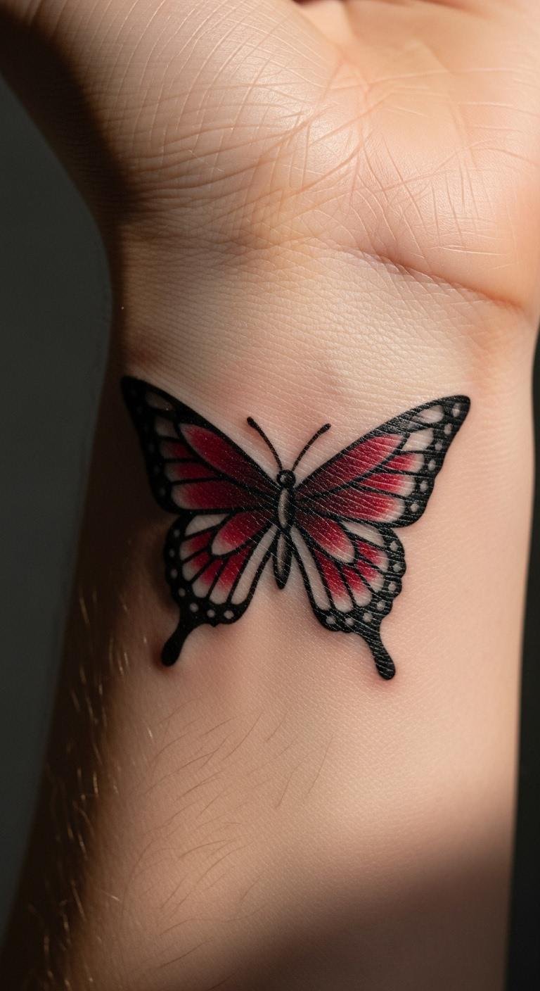 Think about a simple red butterfly wrapping around your wrist. This spot shows off the design every day. Start with a basic sketch on paper to see how it looks. Use free online tools like drawing apps to experiment. For budget tips, visit local tattoo shops for consultations—they often cost little or nothing. Try temporary tattoos first; they cost under $10 and last a week. Pick red shades that match your skin tone for vibrancy. Clean the area with gentle soap before any session. This design symbolizes change and fits daily life. Go for a small size to keep costs low, around $50–$100 for a beginner artist. Add personal touches like a tiny pattern inside the wings.