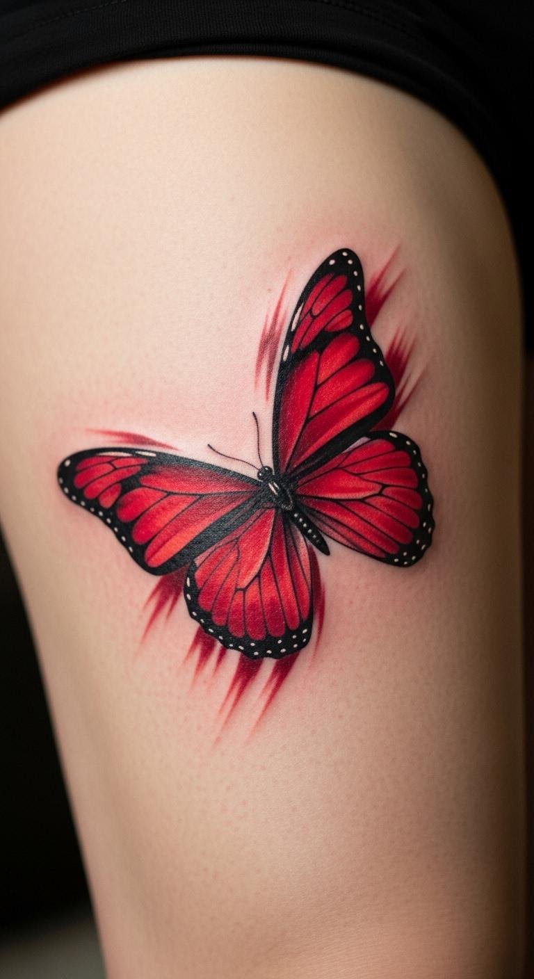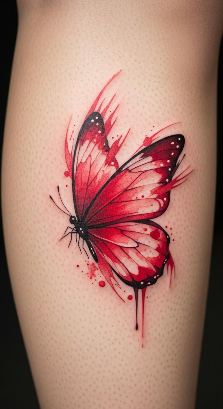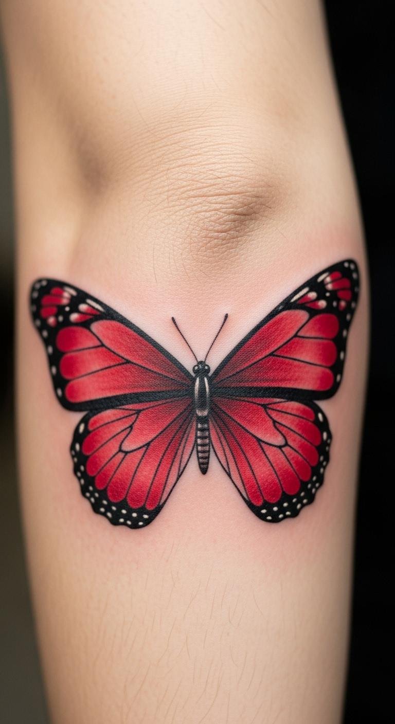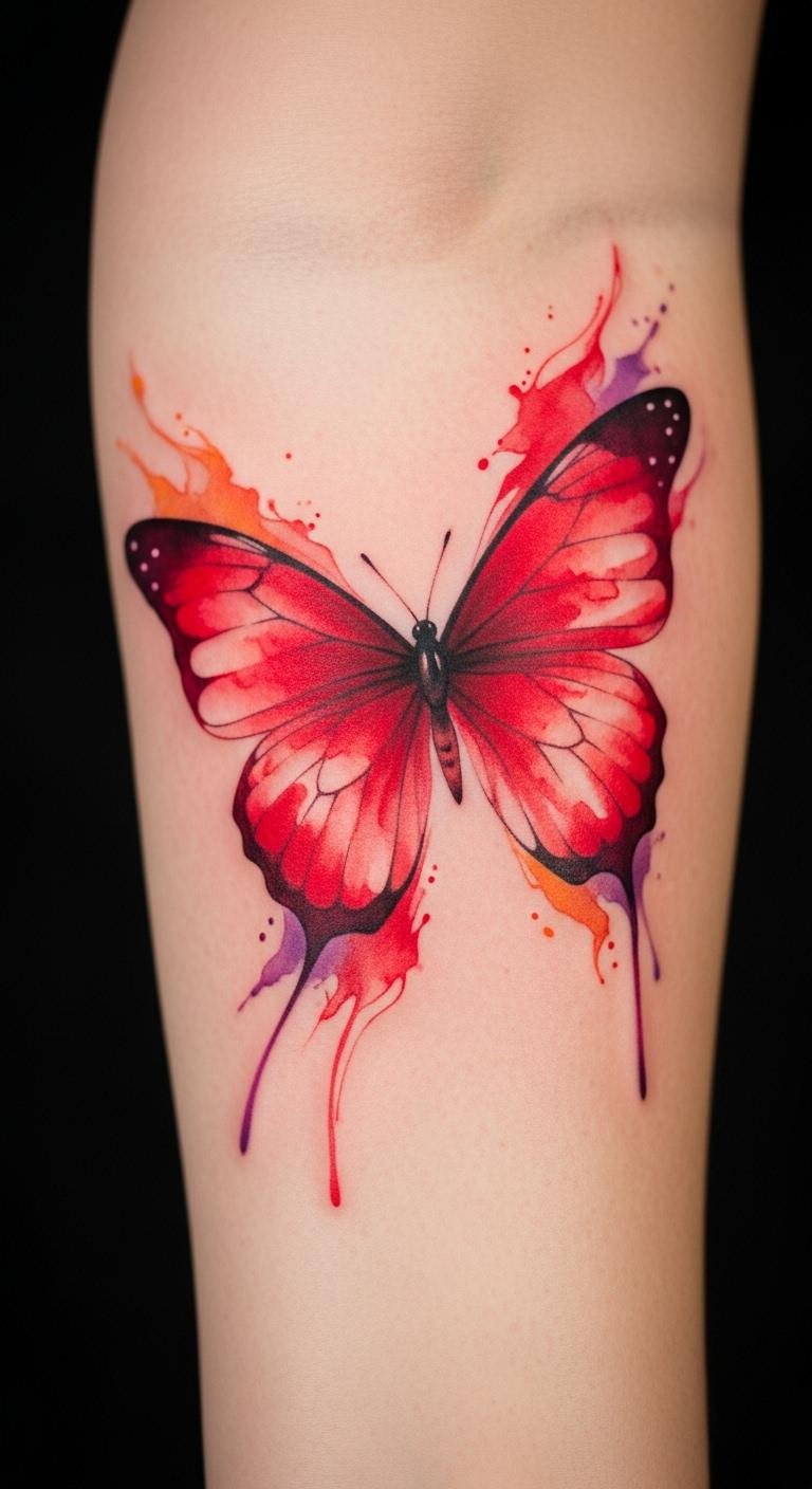 Watercolor styles make red butterflies feel artistic and free. The colors blend like paint on canvas. Draw inspiration from nature photos online. Use washable markers on your skin for a DIY mock-up; it’s cheap and fun. Look for affordable artists who specialize in this technique—prices start at $80. Protect the tattoo from sun with daily sunscreen; grab a bottle for $5. This design pops on visible spots like the arm. Keep it small for less pain and cost. Add elements like faint flowers using free stencil templates. The red hues stay bright with proper care, like moisturizing twice a day.