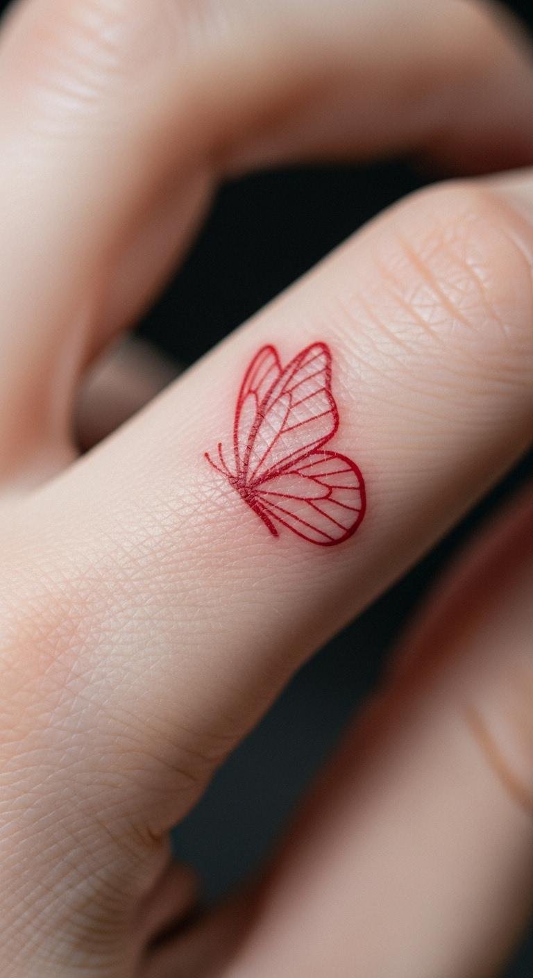 Fine line styles keep red butterflies elegant and simple. Thin lines draw the eye. Practice with fine-tipped pens at home. Download free line art for inspiration. This can cost $50 or less. Try with temporary ink pens. Put it on your finger for a discreet look. Add red for emphasis.
