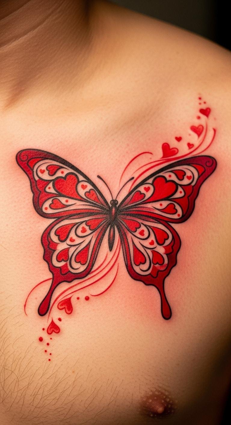 Red butterflies for love carry heartfelt vibes. They mark special bonds. Draw hearts around it on paper. Free love-themed templates abound online. Budget tattoos start at $70. Use red lipstick for quick tests. Place it on your chest for closeness. Keep it meaningful and small.