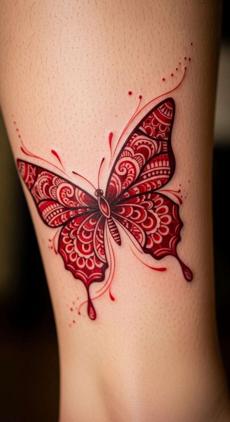 A bold red butterfly stands for courage and strength. Vibrant colors make it pop. Use colored pencils to plan on paper. Free video tutorials can guide your ideas. Artists often charge $100 for this style. Try henna versions at home for $2. Place it on your arm for motivation. Focus on red shades that feel empowering. Keep the design straightforward for fast work.