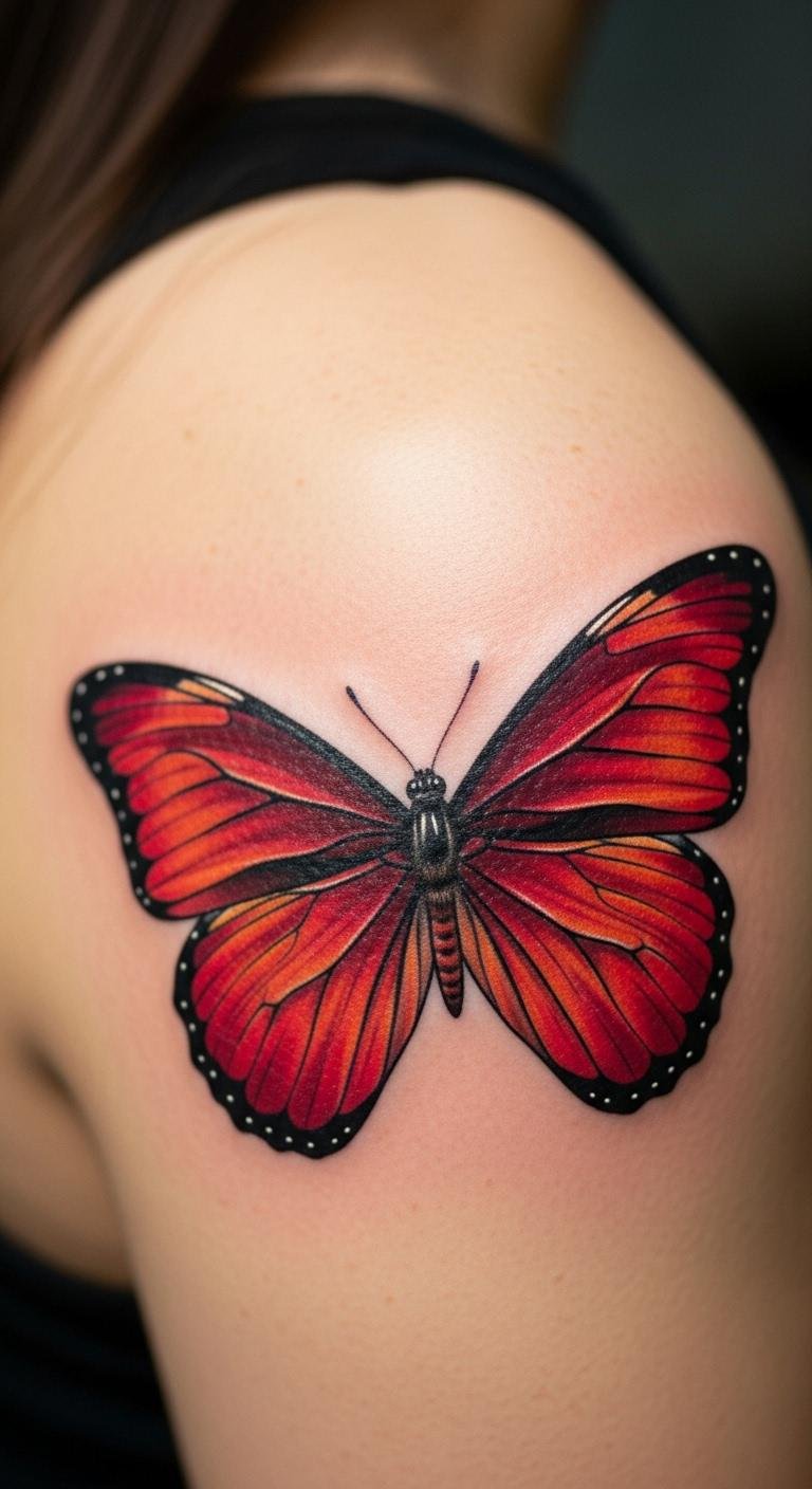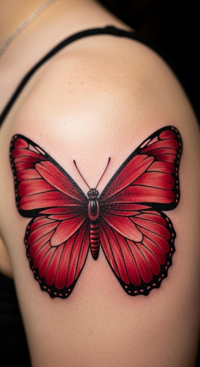 Realistic tattoos bring red butterflies to life with every detail. Wings look almost real, full of depth. Practice by tracing butterfly images from books. Find budget artists through community forums; sessions can be $100 or less. Use a phone camera to snap ideas on your body first. Place it on the shoulder for easy hiding or showing. Bold red ink works best here—ask for samples during visits. Keep the design under 4 inches to save money. Add small details like spots for a story. Cover it with clothing initially to aid healing, using basic lotions from home.