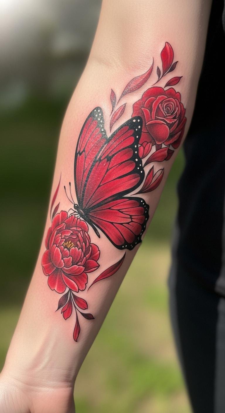 Pairing a red butterfly with flowers adds layers of symbolism. It represents growth and beauty together. Draw simple flower shapes next to the butterfly on paper. Use garden photos for free inspiration online. Budget artists can do this for about $90. Test with stick-on tattoos; buy a pack for $5. Place it on your forearm for easy viewing. Choose red blooms that match your theme. Keep the design balanced to avoid overcrowding. Add personal elements like your favorite flower using basic drawing tools.