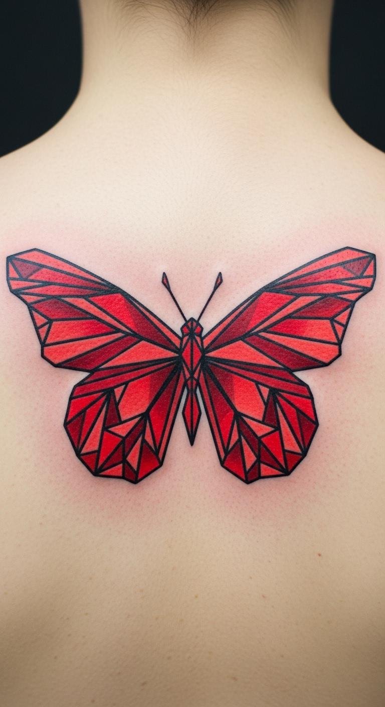 Geometric twists turn red butterflies into modern art. Sharp lines and shapes create a unique vibe. Experiment with graph paper and a ruler at home. Free software can help design patterns quickly. Find deals at studios for around $70. Try it on with printable stencils; they’re inexpensive. Put it on your back for a bold statement. Use red to highlight key angles. Keep sizes moderate for quicker sessions. This design mixes fun and meaning easily.