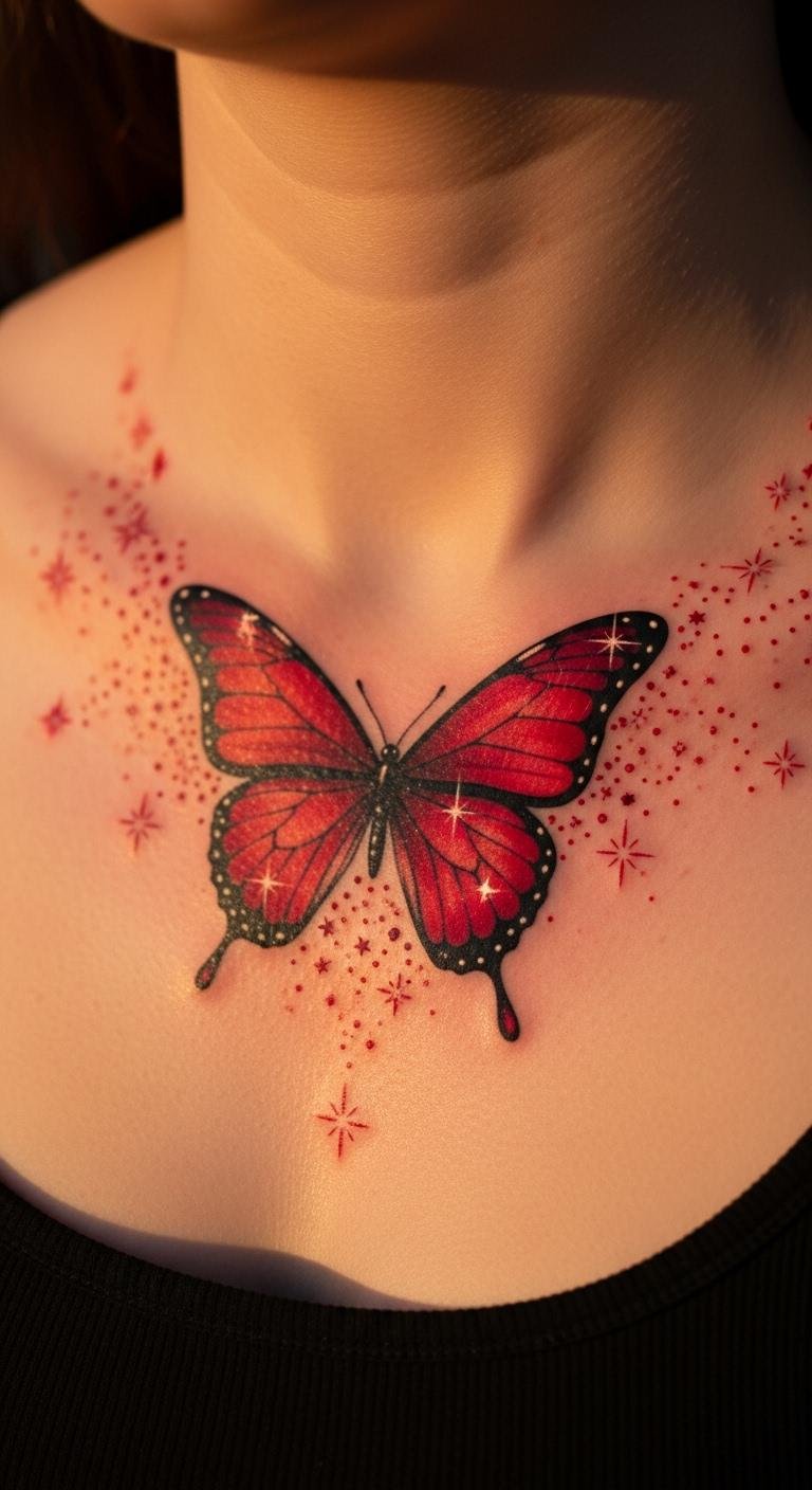 Stars with a red butterfly add a celestial touch. It speaks of dreams and journeys. Draw stars around the butterfly using free apps. Local events might have cheap tattoo fairs. Stickers for testing cost about $5. Put it on your collarbone for a starry effect. Use red to tie in the theme. Designs like this fit in 30 minutes.