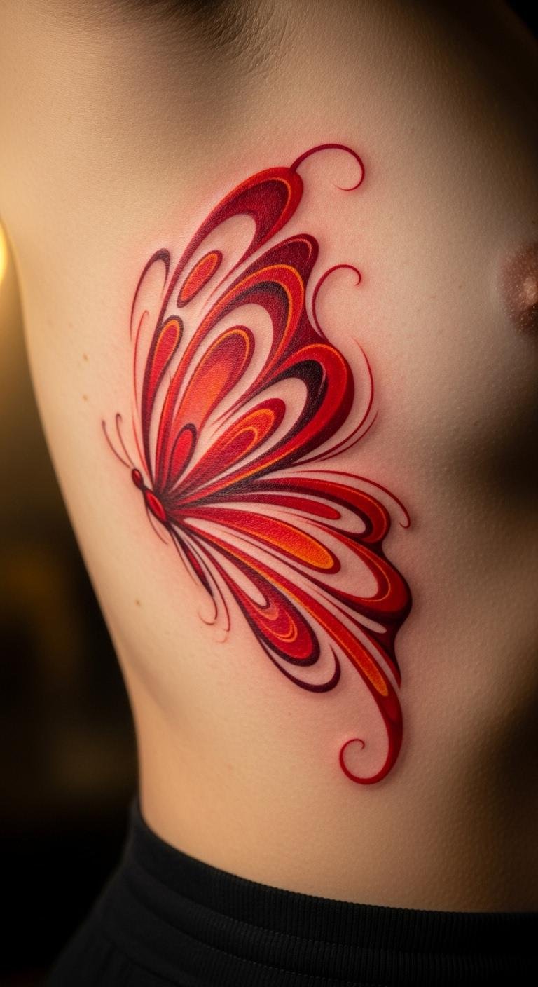 Abstract red butterflies let imagination run wild. Swirls and shapes create mystery. Play with abstract drawings at home. Online communities share ideas for free. Budget options start at $75. Use body paint for trials; it’s under $10. Place it on your rib for a personal hideaway. Add red accents for flair. This style sparks creativity easily.