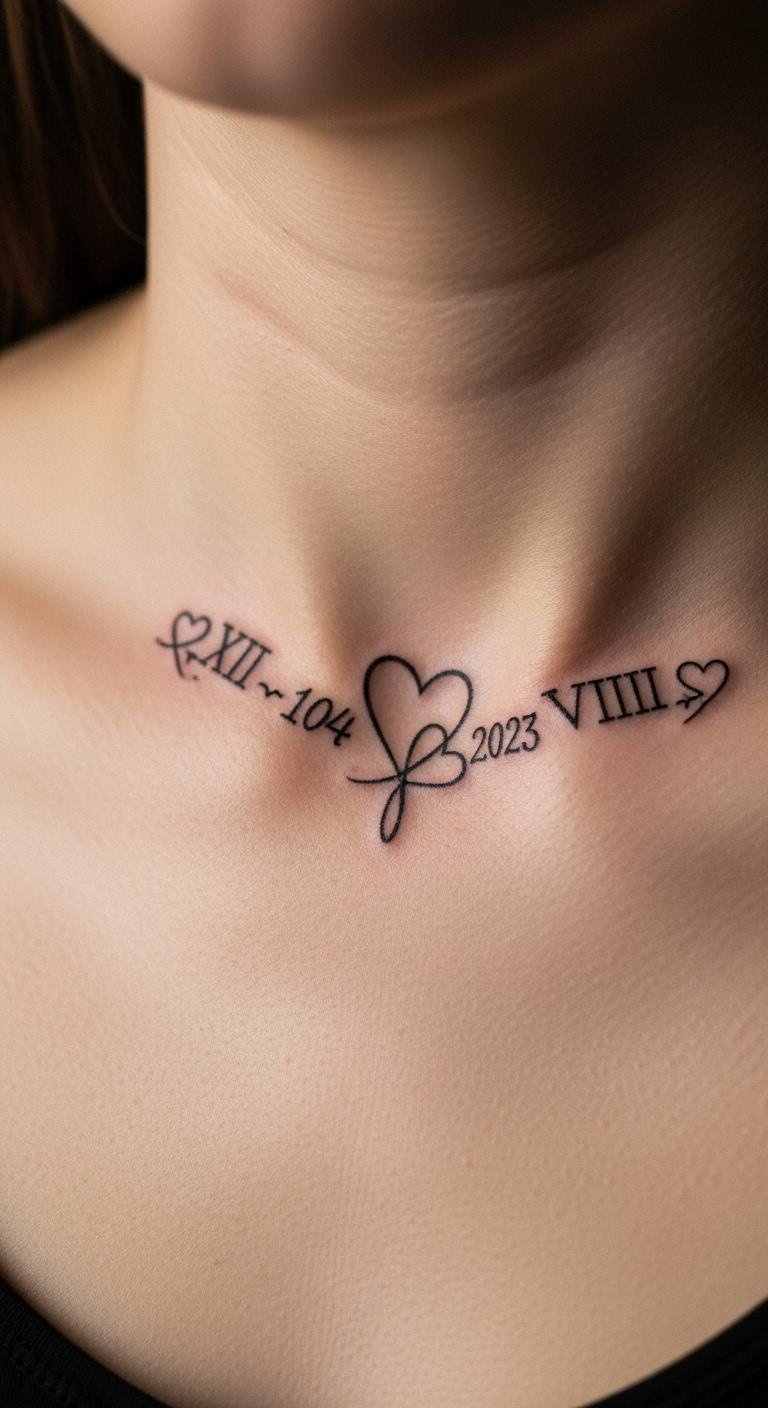 Incorporate hearts with Roman numerals for anniversaries. Try your collarbone for elegance. Select your special date. Sketch heart combinations at home. Find free heart templates online. Use few elements to stay cost-effective. This design adds warmth. Make it romantic and personal. It’s a sweet reminder.
