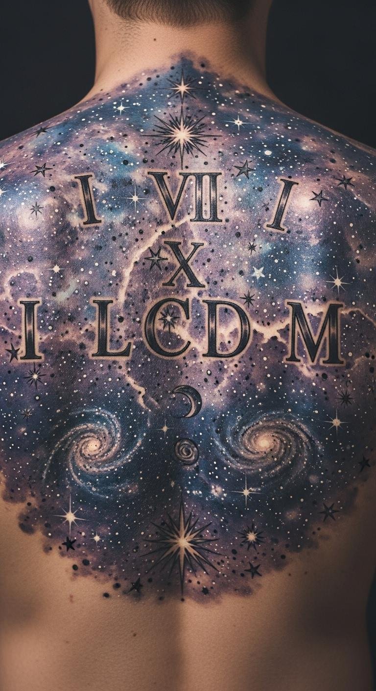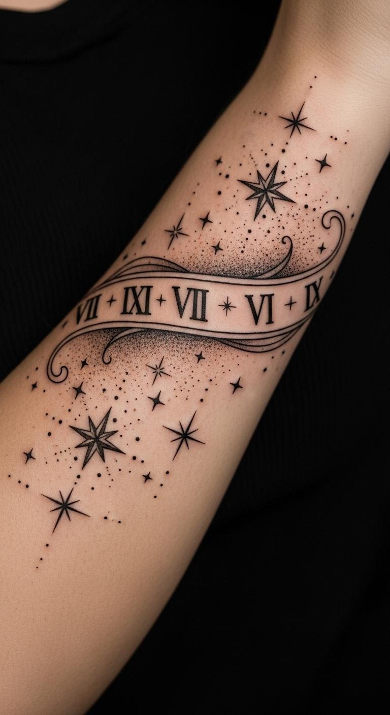 Incorporate stars around Roman numerals for big life events. Place it on your back for impact. Select stars that represent your journey. Sketch stars at home with simple tools. Look for free celestial templates online. Keep the design compact to stay budget-friendly. This idea adds a dreamy feel. Pair it with a date that changed your path. Make adjustments based on your preferences. The final tattoo feels magical and personal.