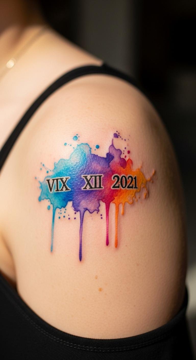Blend watercolor effects with Roman numerals for your birthdate. Put it on your shoulder for easy coverage. Select colors that match your vibe, like soft blues. Practice with washable markers at home to experiment. Find free online tutorials for DIY inspiration. This style adds vibrancy without high costs. Keep the design small to fit your budget. It’s perfect for first-timers seeking something fun. Combine it with a tiny symbol for personalization. Focus on what makes the date special to you. The result feels fresh and alive on your skin.