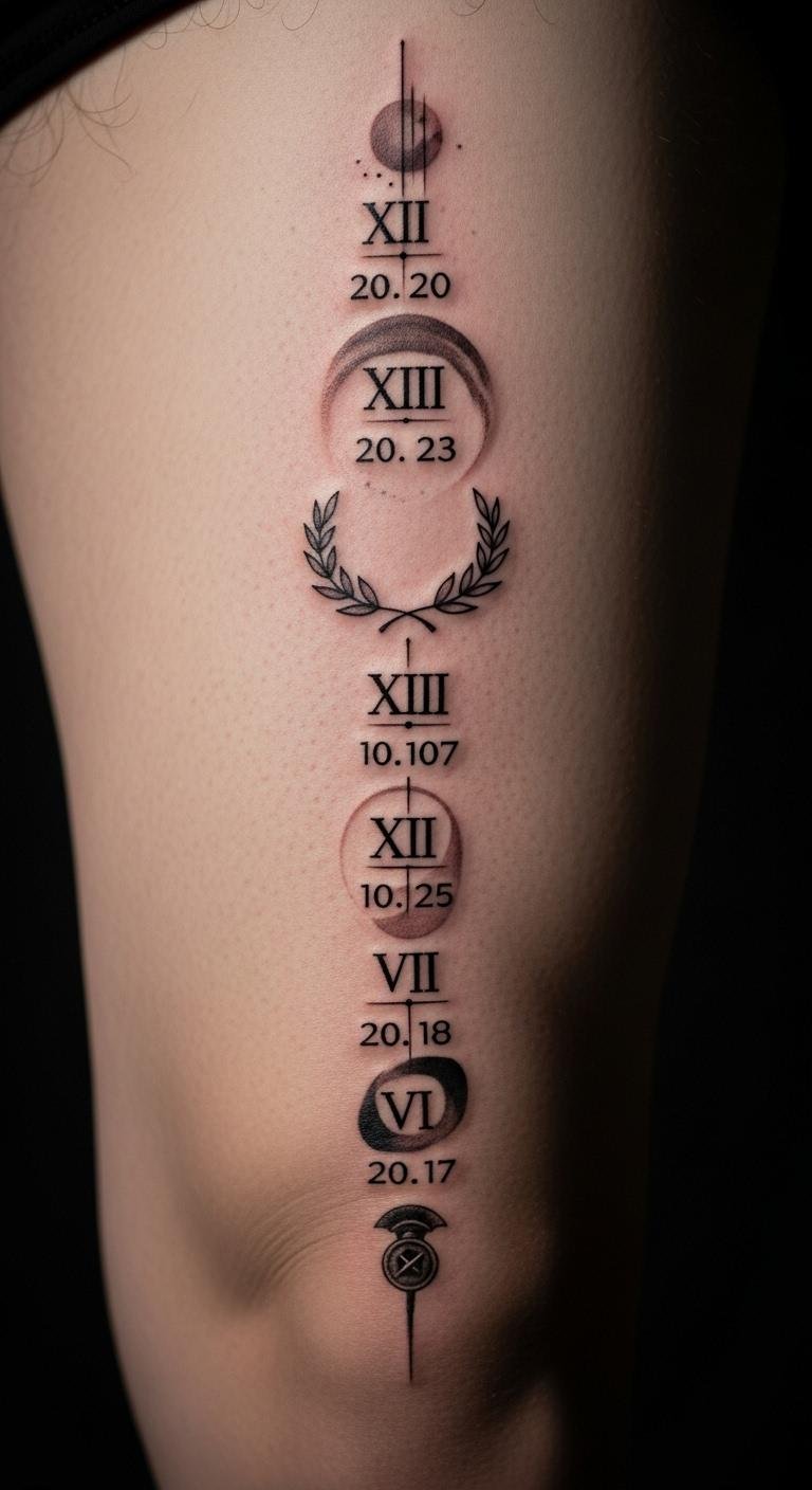 Build a story with Roman numerals on your thigh. This spot allows for details. Select key life events. Draw storyboards at home. Search for narrative ideas online. Link numerals smoothly. This design shares your tale. Keep it budget-friendly. Make it your visual diary.