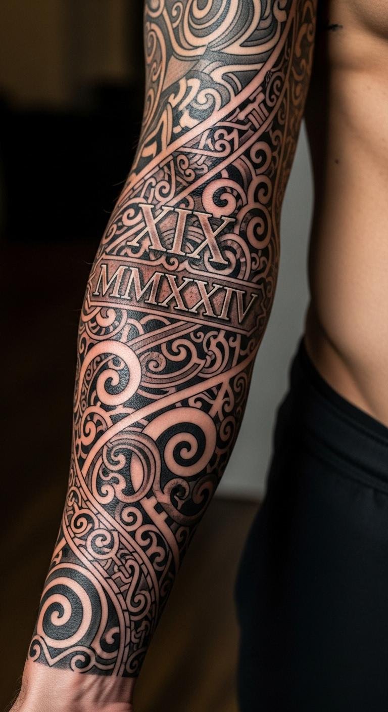Blend cultural elements with Roman numerals on your arm. This honors your roots. Pick a heritage date. Sketch cultural symbols. Find fusion ideas online. Use basic additions. This tattoo celebrates identity. Make it personal and proud. It’s a cultural nod.