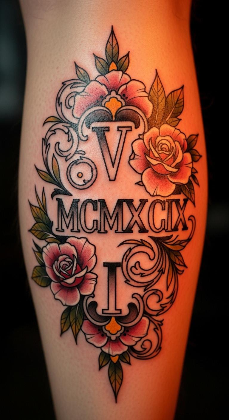 Mix neotraditional style with florals around Roman numerals. Try your calf for a hidden spot. Pick flowers that hold meaning, like roses for love. Draw rough ideas on paper to plan ahead. Use affordable apps for layout help. Add just a few petals to keep costs down. This design stands out with its edges and details. Make it your own by choosing colors you like. It’s a great way to mark a milestone. Keep the process light and enjoyable.