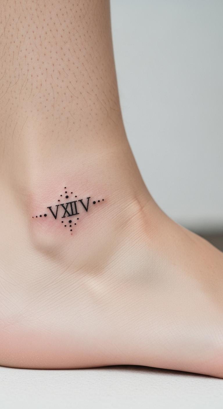 Honor loved ones with Roman numerals and dot details. Put it on your ankle for a discreet option. Pick a date that holds memories. Use a pen to test the layout at home. Find dot pattern ideas online for free. Keep it minimal to cut costs. This design offers quiet tribute. Make it unique with personal touches. The process brings comfort and closure.