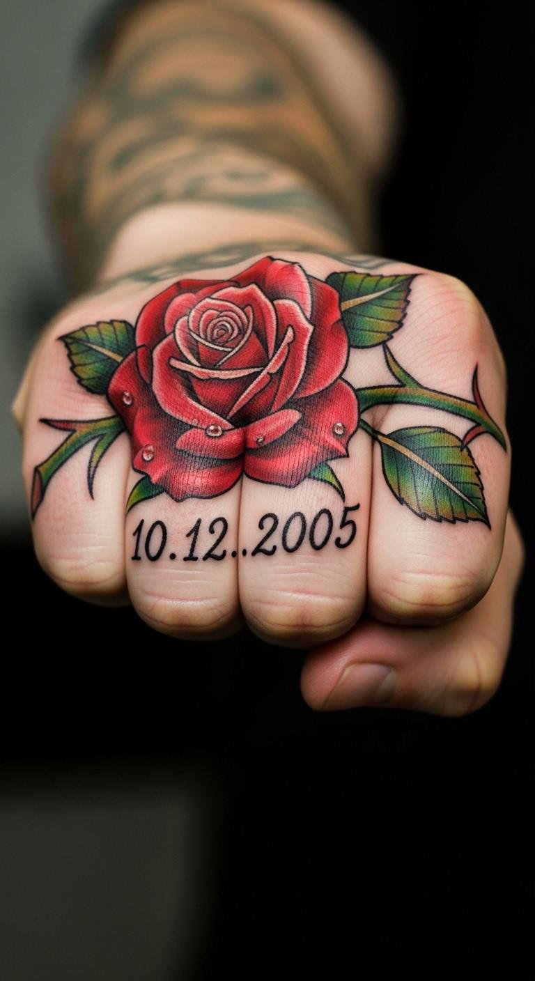Pair a rose with a date on your knuckle for memory. It marks moments simply. Note the date beside a rose drawing. This ensures it aligns. Find add-on services for $50. Artists incorporate numbers easily. Use date stamps for $2 to preview. Place and review daily. Opt for early bookings to save. Choose clear digits for quick work. Plan with free tools. This personal touch won’t cost much.