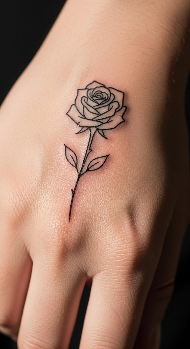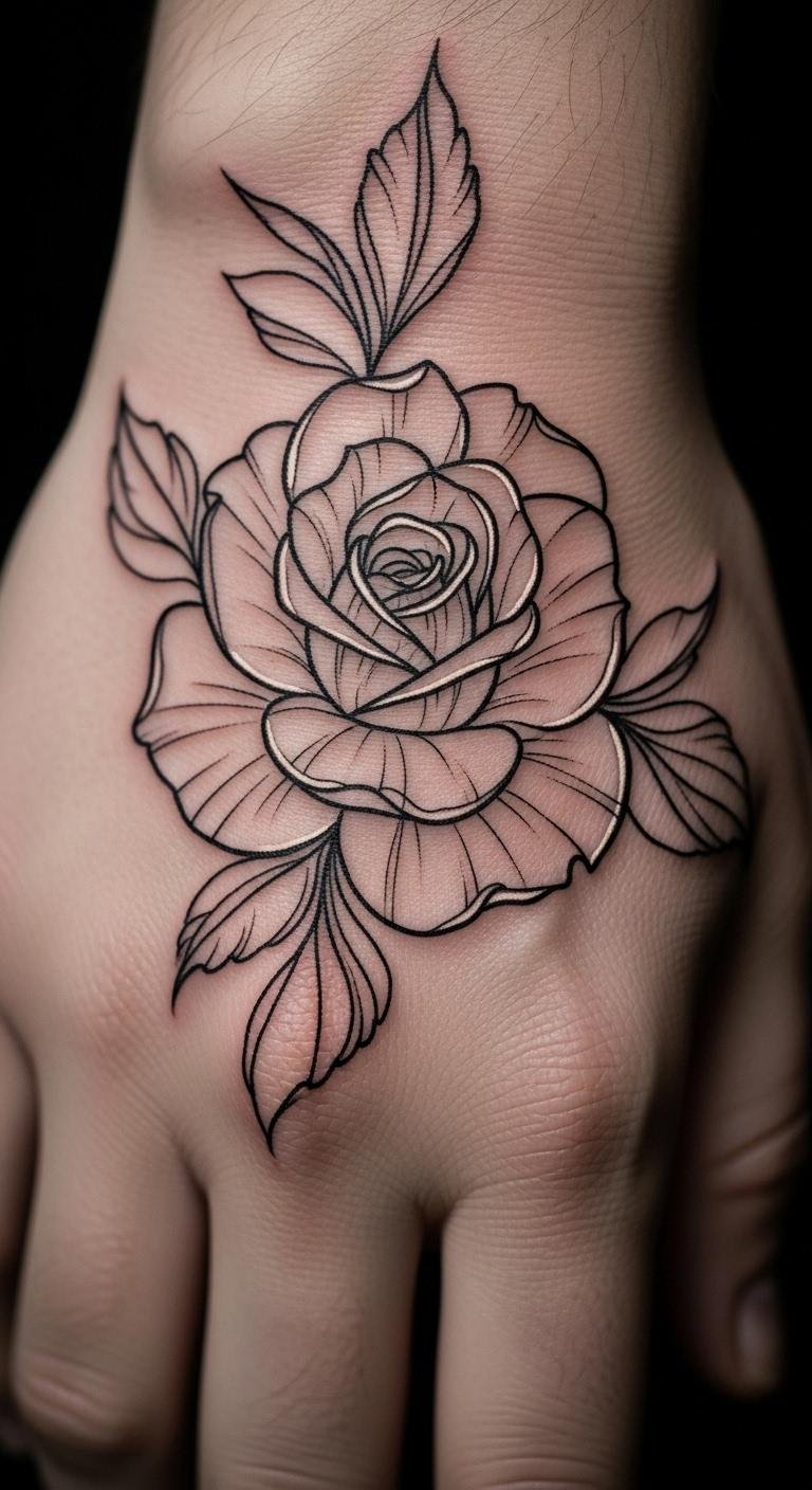 An outline-only rose on the back of your hand keeps it light. It lets your skin show through. Sketch the outline at home quickly. This checks the flow. Find basic ink jobs for $40. Artists do outlines fast. Use outline transfers for $1. Stick and see. Pick off-peak for deals. Add details later if needed. Snap for reference. This simple start saves money.