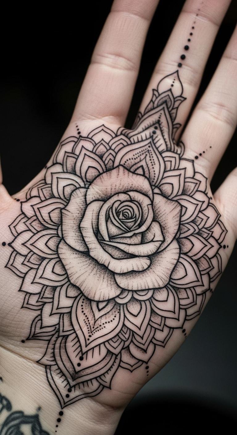 A rose with a mandala on your palm fuses cultures. It creates a detailed piece. Combine sketches on paper to fit. This plans the mix. Seek fusion styles for $90. Artists layer elements. Try mandala templates for $5. Apply and adjust. Book wisely for rates. Focus on core designs. Use digital mocks. This blend works without high costs.