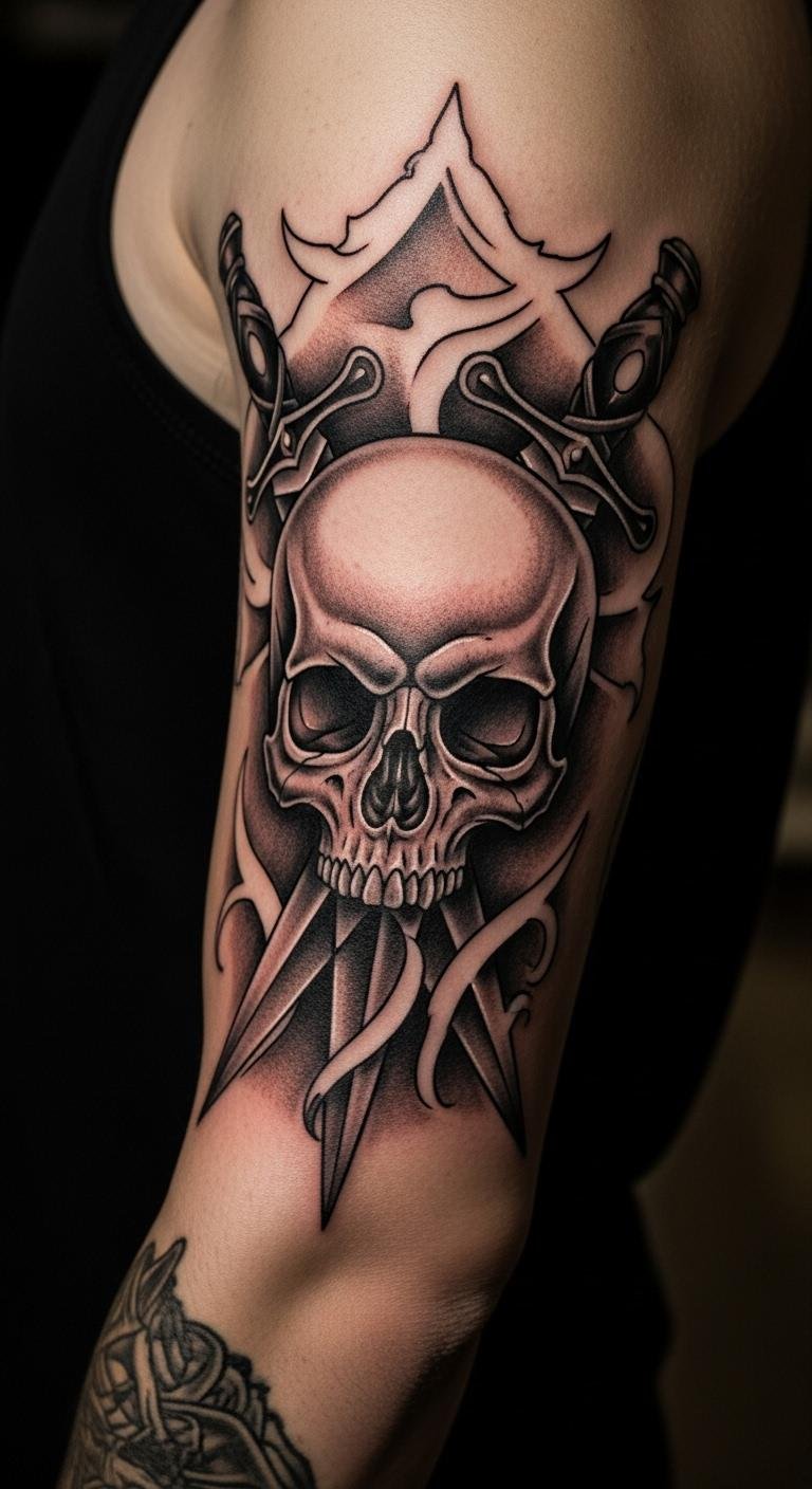 Skulls with daggers show edge. They mix danger and strength. Sketch weapons around the skull. Free action apps inspire. Put it on your arm for show. It works for various outfits. Watch for holiday sales at shops. They cut prices. Use multiple daggers for layers. Try knife drawings at home. Paper suffices. Real tip: etch on wood for a 3D view. Keep it simple to save. These ideas amp up style.