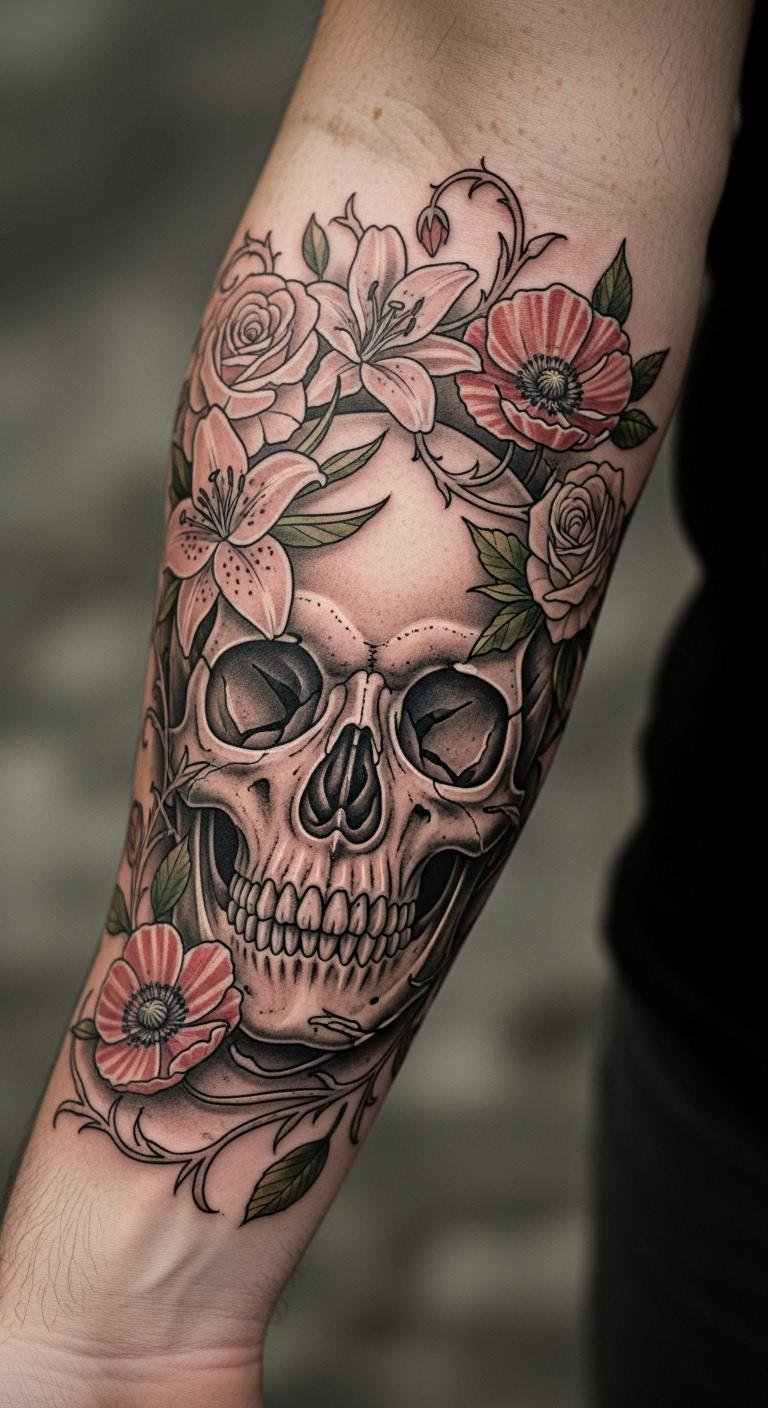 Pair skulls with flowers for balance. It mixes toughness and beauty. Sketch petals around the skull. Free floral apps add ideas. Place on your forearm for daily view. It heals fast too. Look for bundle packages at studios. They reduce costs. Use different flowers for meaning. Try pressing real ones for inspiration. Costs nothing and sparks creativity. Real tip: draw with colored markers first. Test the contrast. These tattoos offer personal depth.