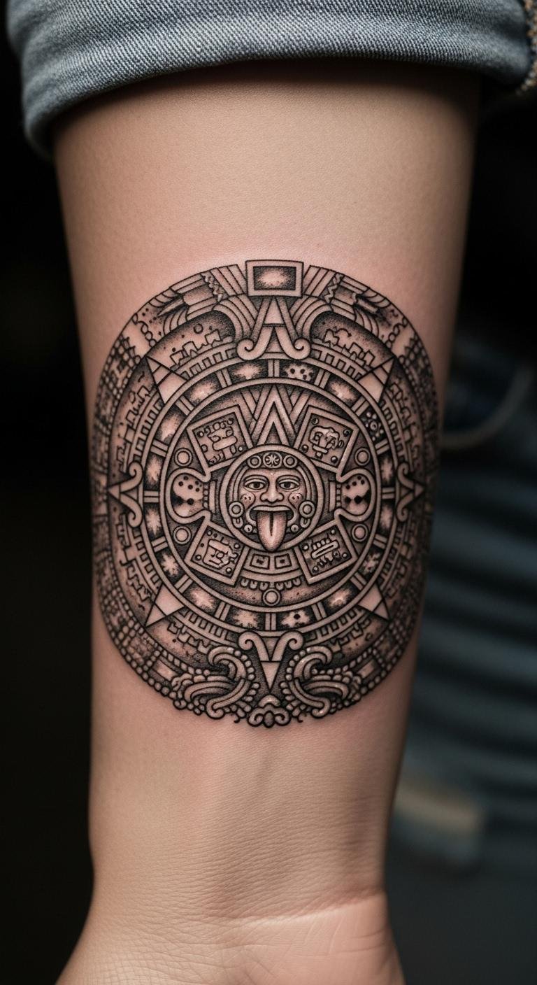Aztec calendar symbols bring ancient vibes. Place a small one on your collarbone. It stands for time and heritage. Draw circles and lines on paper first. Use household items like coins for shapes. It’s a no-cost DIY start. Check local fairs for tattoo vendors. They often have deals. A petite design might run $40. Practice with washable markers at home. Draw it daily to decide. Incorporate personal dates into the pattern. This keeps it meaningful. Opt for basic ink to keep it affordable. You’ll connect with roots in a simple way.