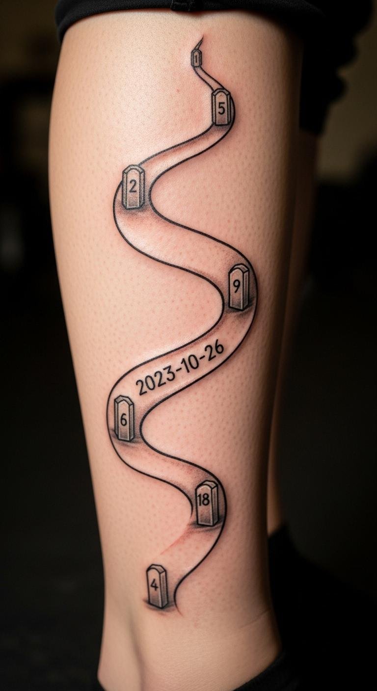 Mark life events with sonder paths. Include a date on a trail. Write on a calendar first—free step. Place on your leg for remembrance. Milestone ink is about $70. Personalize with symbols. Tip: note events on paper. It helps decide easily. Bold the essential: event paths. Step into a tattoo that marks your journey.