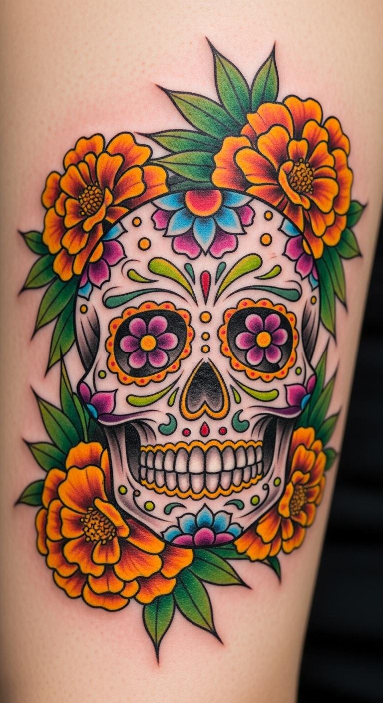 Think about a simple sugar skull design with marigolds for a timeless look. Start with a basic outline of the skull on paper. Add marigold details using colored markers to sketch your idea. This costs less than $5 in supplies. Place it on your forearm for easy viewing. Pair it with family symbols, like a small heart, to make it personal. Artists often charge $100–200 for this size, so shop around local studios. Try a temporary tattoo first; kits are under $10 online. Keep colors bright with high-quality ink tips from pros. This setup lets you celebrate heritage without overcomplicating things. Mix in other flowers for a unique twist. Focus on what feels right for you. Get feedback from friends before committing. You’ll end up with a piece that tells your story.
