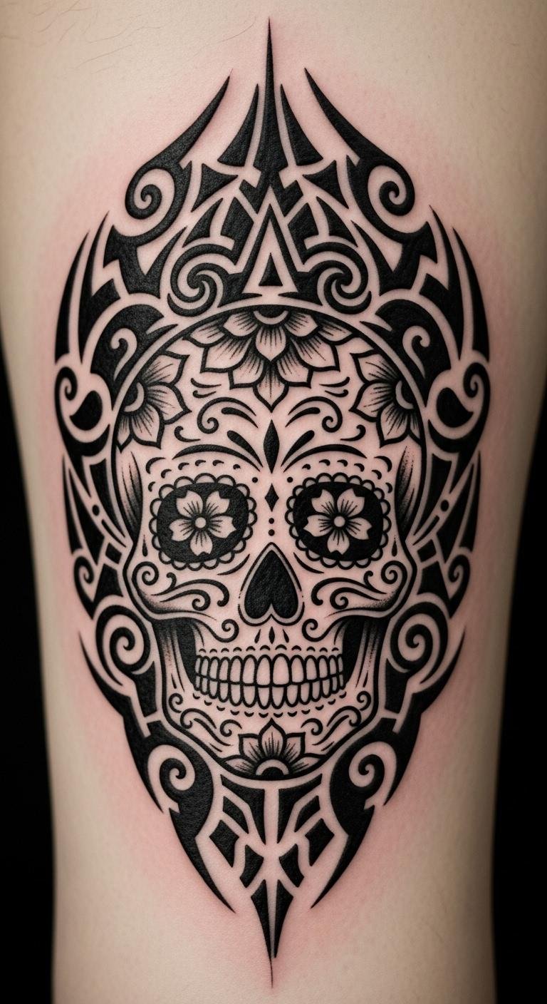 Fuse tribal elements into a sugar skull. Trace patterns on paper with a pen. Mix styles easily. Choose a bicep spot. Artists price at $210. Find tribal inspirations online. Add your twist. Keep lines strong. Use tribal stickers for trials. This merges cultures simply.
