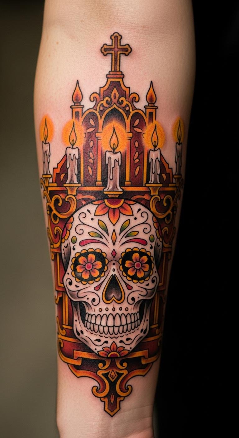 Sugar Skull with Candles and Altars