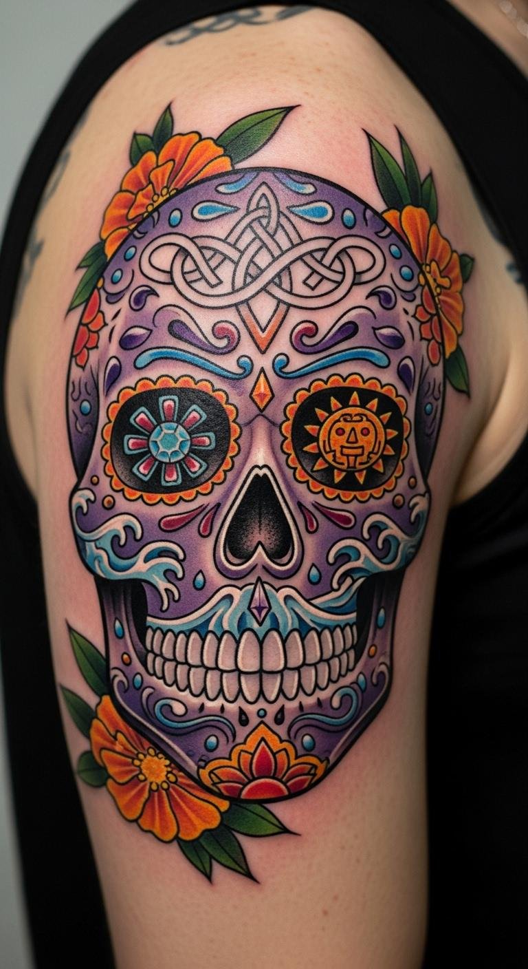 Fuse other cultural elements into a sugar skull. Draw combined symbols on paper. Experiment freely. Put it on your leg. This is around $260. Search for fusion ideas. Add what matters. Stay respectful. Use mixed stencils. This creates a unique piece.