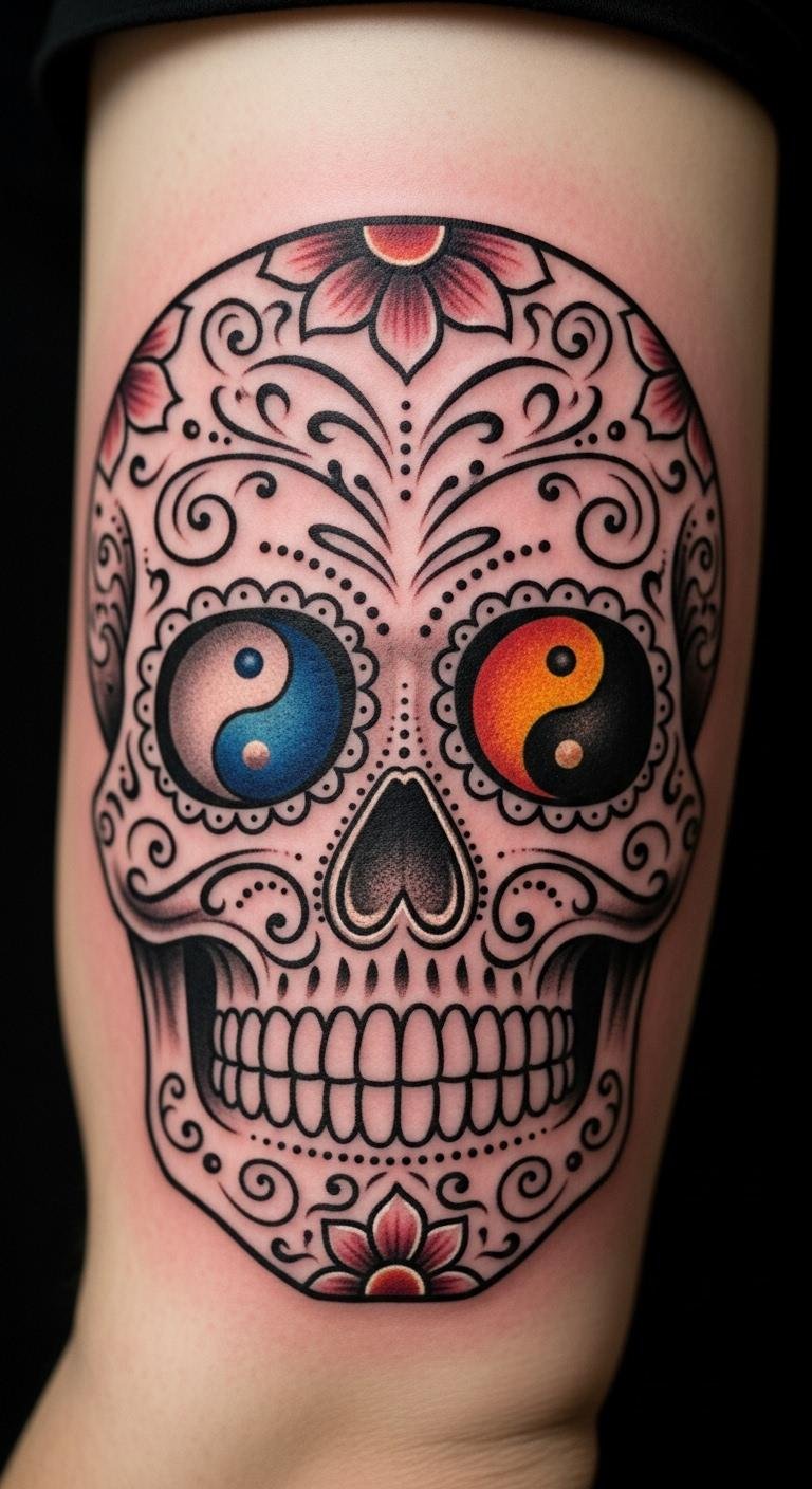 Balance a sugar skull with yin-yang. Sketch the duo on paper. Use basic tools. Spot it on your back. Expect $220. Use balance apps. Personalize the flow. Keep it harmonious. Test with dual stickers. This adds depth simply.