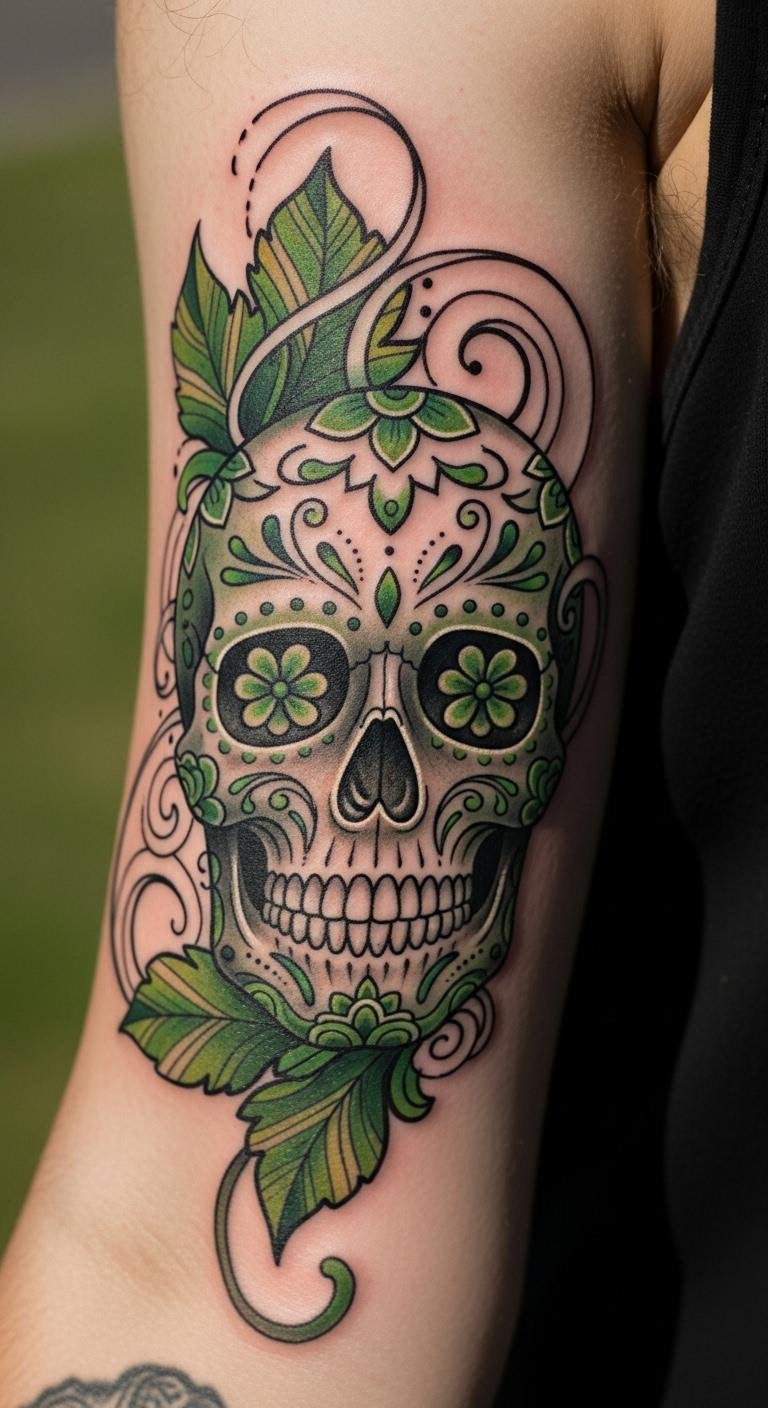 Theme your sugar skull with nature elements. Draw leaves on paper with greens. Go natural. Place on your ankle. This runs $210. Pull from outdoor photos. Add seasonal touches. Maintain freshness. Use leaf rub-ons. You’ll connect with nature.