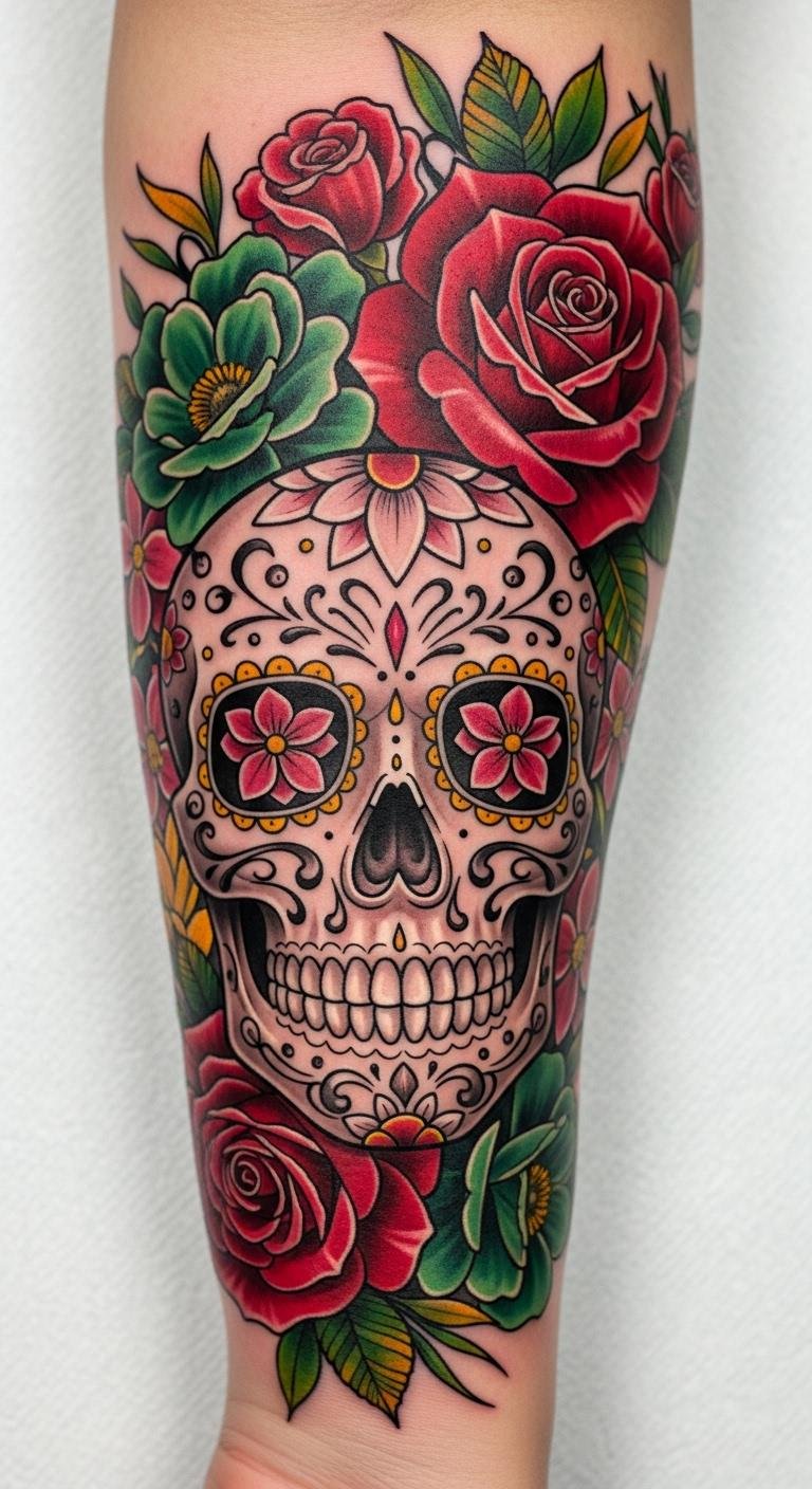 Incorporate roses into your sugar skull for extra flair. Draw flowers around the skull on paper with markers you already have. This takes minutes and costs nothing extra. Choose a back spot for a larger design. Artists charge around $200 for this. Use garden photos for inspiration; it’s free. Add thorns or leaves for a personal touch. Keep the layout balanced. Try fabric transfers for a temporary tryout, under $5. This idea makes your tattoo unique and meaningful.