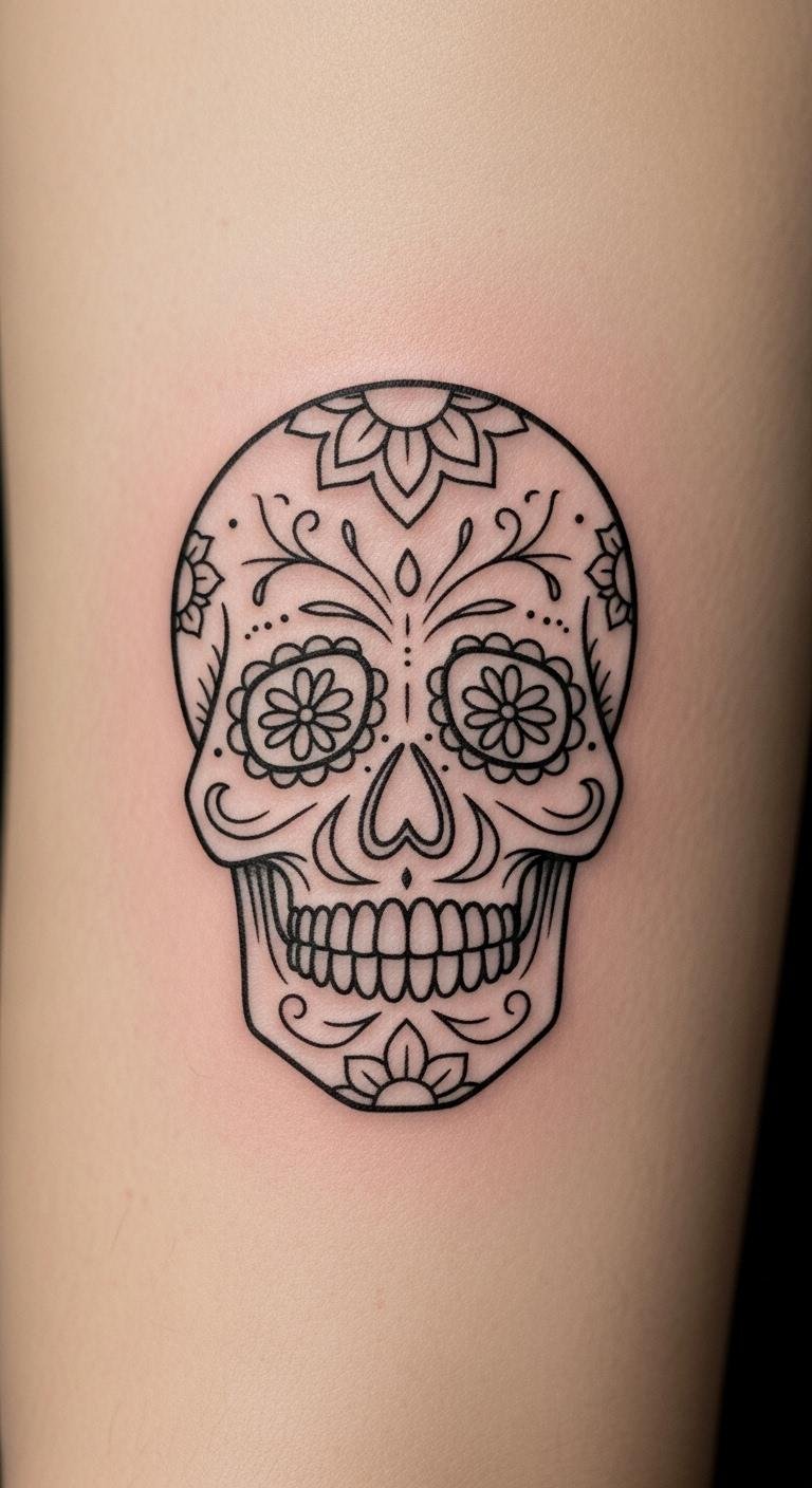 Go minimalist with a clean sugar skull outline. Use a pen to trace it on paper at your desk. No fancy tools needed. Place it on your finger for something small. This could cost $100 at a shop. Snap a phone pic to plan it out. Add a tiny detail, like a dot, to make it yours. Keep lines straight and simple. Practice with a sharpie on your skin first. You’ll have an elegant design ready.