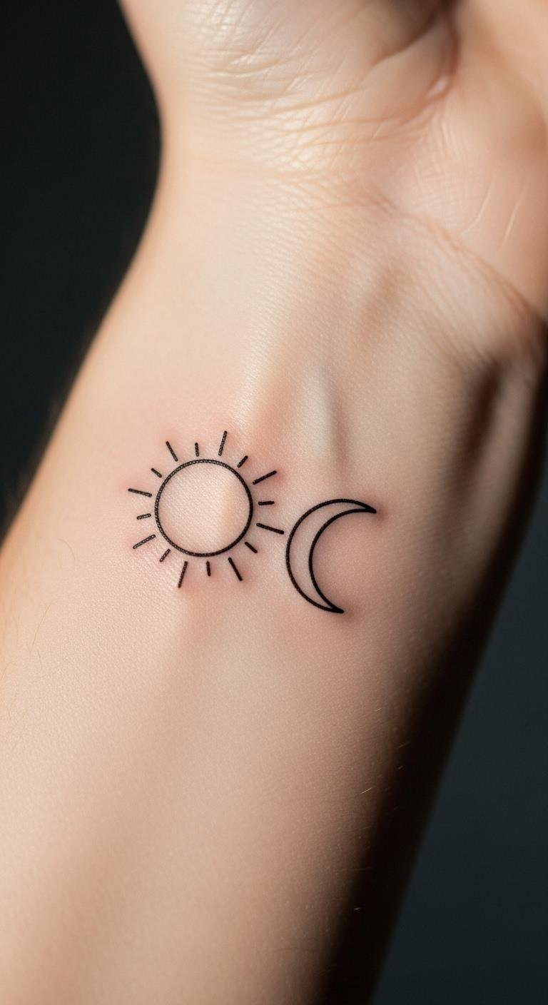 A small wrist sun and moon fits tight spaces with big meaning. It’s discreet yet powerful. Easy to hide. Mini on paper first. Free small design tools help. Artists offer at $60. Keep on wrist. Practice with tiny tools. Soap maintains. Great for starters. Draw daily plans.