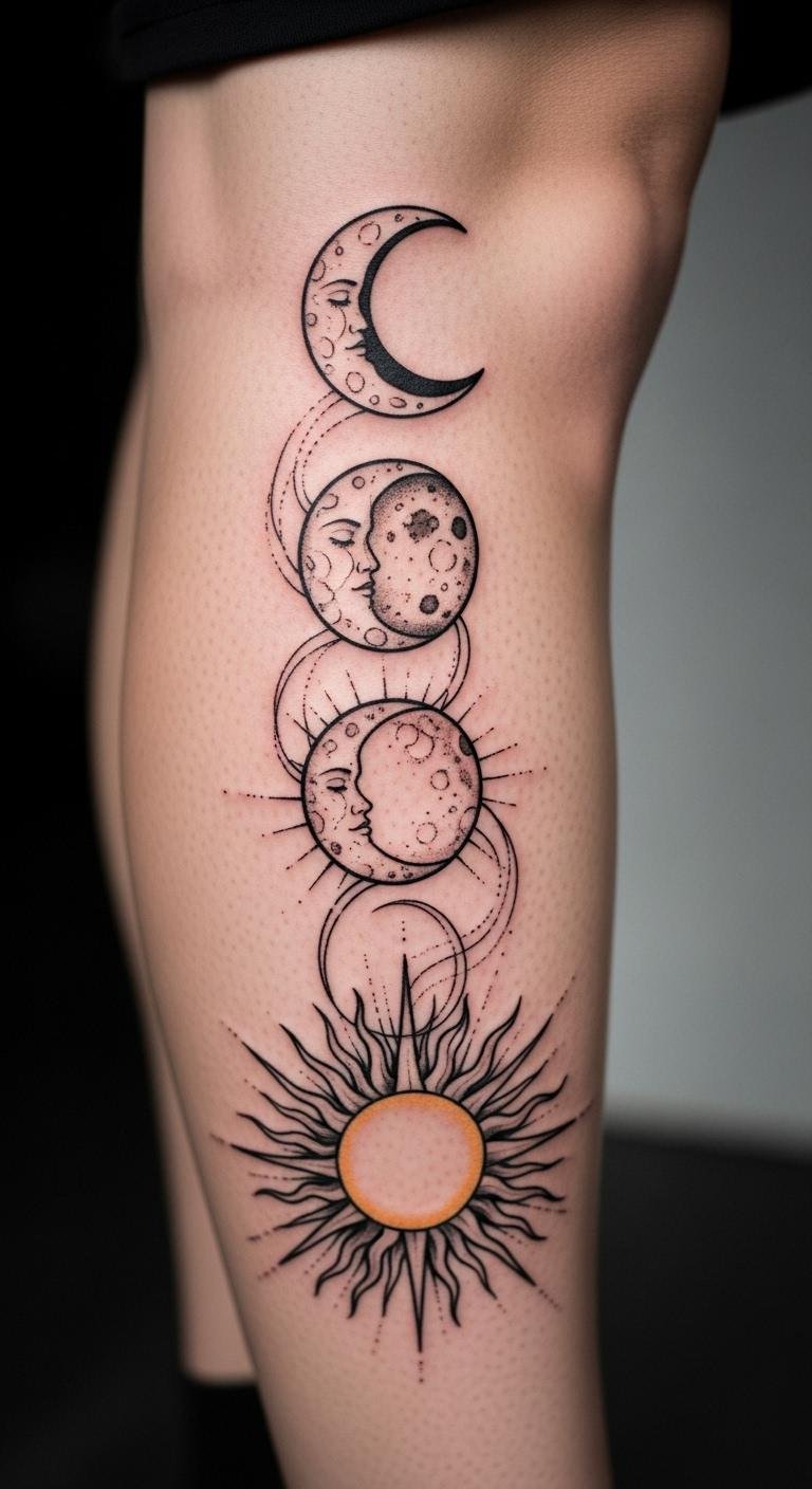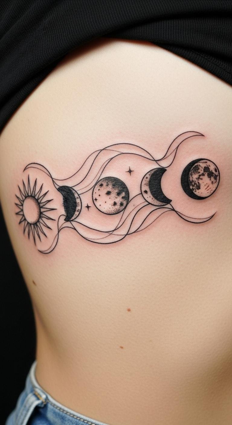 A celestial cycle design tracks sun and moon phases in a row. It represents ongoing change. Simple and storytelling. Sequence on paper with dots. Free phase trackers assist. Studios offer at $130. Site on ribs for personal space. Add arrows with markers. Cream preserves details. Fits life journeys. Practice the flow.