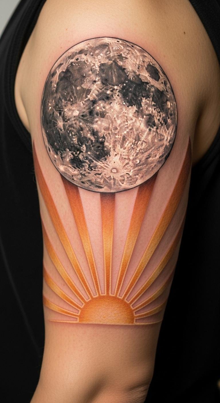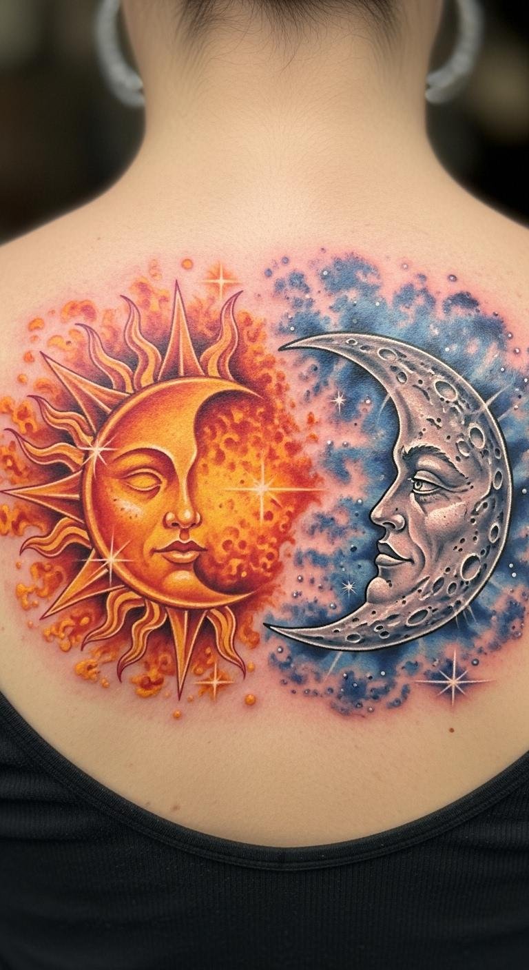 Go realistic with detailed sun and moon for a lifelike feel. It brings nature to your body. Precise and striking. Shade on paper carefully. Free photo editors mimic looks. Expect $150 for details. Place on back for impact. Use photos for practice. Soap keeps realism. Ideal for nature lovers. Sketch references first.