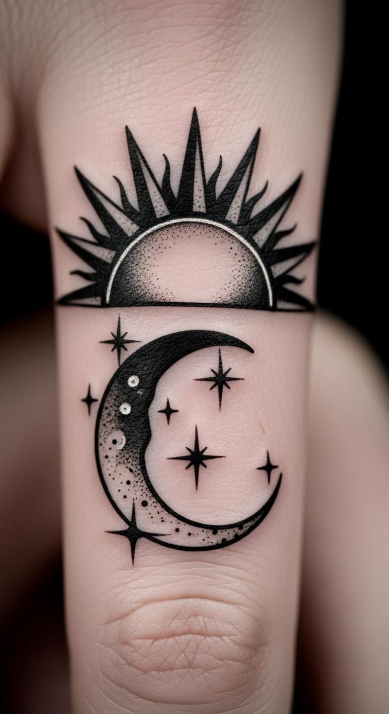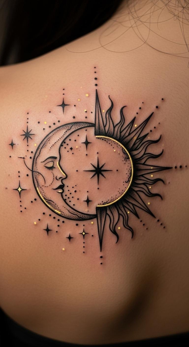 Add stars to sun and moon for a full celestial scene. This idea brings extra sparkle, linking to night skies. It enhances the balance theme. Dot stars on paper with a pen. Free star map apps aid design. Artists might bundle extras for less, around $140. Site it on your shoulder for flair. Use stickers for home tests. Oil from your kitchen helps maintain. Perfect for adventure vibes. Sketch the layout at home.